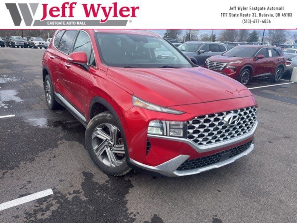 Jeff Wyler Eastgate Auto Mall is proud to offer this stunning 2021 Hyundai Santa Fe SEL in Calypso Red. Well equipped with: Convenience Package (12.3" LCD Instrument Cluster, Acoustic-Laminated Front Side Windows, Auto-Dimming Inside Rear-View Mirror, Digital Key, Dual Automatic Temperature Control, Hands-Free Smart Liftgate w/Hands-Free Auto Open, Leather Wrapped Steering Wheel, LED Taillights, Manual Rear Side Sunshades, Option Group 02, Power Release 2nd Row Seats, Puddle Lamps, Side Mirrors w/Turn Signal Indicators, and Ultrasonic Rear Occupant Alert), 18" x 7.5J Alloy Wheels, 4-Wheel Disc Brakes, 6 Speakers, ABS brakes, Air Conditioning, Alloy wheels, AM/FM radio: SiriusXM, Apple CarPlay & Android Auto, Auto High-beam Headlights, Axle Ratio: 3.798, Brake assist, Bumper Applique, Bumpers: body-color, Cargo Tray, Carpeted Floor Mats, Delay-off headlights, Driver door bin, Driver vanity mirror, Dual front impact airbags, Dual front side impact airbags, Electronic Stability Control, Emergency communication system, Exterior Parking Camera Rear, First Aid Kit, Four wheel independent suspension, Front anti-roll bar, Front Bucket Seats, Front Center Armrest, Front reading lights, Fully automatic headlights, Heated door mirrors, Heated Front Bucket Seats, Heated front seats, Illuminated entry, Low tire pressure warning, Mudguards, Occupant sensing airbag, Outside temperature display, Overhead airbag, Overhead console, Panic alarm, Passenger door bin, Passenger vanity mirror, Power door mirrors, Power driver seat, Power steering, Power windows, Radio: AM/FM/MP3 Display Audio, Rear anti-roll bar, Rear seat center armrest, Rear window defroster, Rear window wiper, Remote keyless entry, Security system, Speed control, Speed-sensing steering, Split folding rear seat, Spoiler, Steering wheel mounted audio controls, Tachometer, Telescoping steering wheel, Tilt steering wheel, Traction control, Trip computer, Variably intermittent wipers, and YES Essentials Stain-Resistant Cloth Seat Trim. Clean CARFAX. Ask about available certifications. Used vehicles 10 years of age or newer with less than 100,000 miles are eligible for the Wyler Assurance Program, but eligible vehicles must pass our reconditioning process and multi-point inspection. Provided the vehicle passes inspection, vehicles will be eligible for the 6 month/6,000 mile limited warranty. The 6 month/6,000 mile limited warranty is NOT available on AS-IS vehicles, wholesale vehicles, lease buyback/pass-thru vehicles or un-inspected vehicles. Note that this program can also apply to vehicles where the remaining factory coverage is less than 6 months or 6,000 miles. Please check the Federal Trade Commission (FTC) Buyers guide on the vehicle for full details as to whether or not warranty coverage may apply. Contact Dealer for additional details. The Wyler Assurance 6 month/6,000 Mile limited warranty ends 6 months from the date of the Retail Purchase Agreement (BUYERS ORDER) or when the vehicle's odometer registers 6,000 additional miles to the mileage listed on the BUYERS ORDER, whichever comes first. Your Deductible - The warranty holder on your contract pays the first $100 of each covered repair.