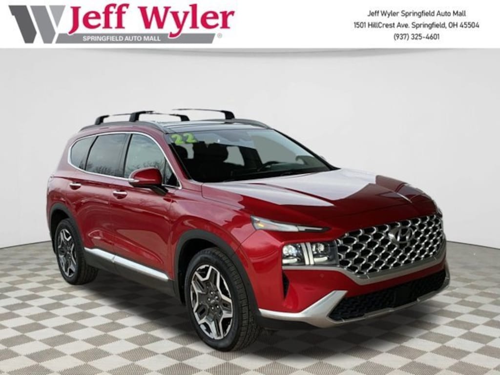 Jeff Wyler Springfield Auto Mall is honored to offer this great-looking 2022 Hyundai Santa Fe Limited in Calypso Red. Well equipped with: Option Group 01, 12 Speakers, 4-Wheel Disc Brakes, ABS brakes, Air Conditioning, Alloy wheels, AM/FM radio: SiriusXM, Apple CarPlay & Android Auto, Auto High-beam Headlights, Auto-dimming Rear-View mirror, Automatic temperature control, Axle Ratio: 3.316, Brake assist, Bumpers: body-color, Cargo Net, Cargo Tray, Carpeted Floor Mats, Delay-off headlights, Driver door bin, Driver vanity mirror, Dual front impact airbags, Dual front side impact airbags, Electronic Stability Control, Emergency communication system, First Aid Kit, Four wheel independent suspension, Front anti-roll bar, Front Bucket Seats, Front Center Armrest, Front dual zone A/C, Front reading lights, Fully automatic headlights, Garage door transmitter: HomeLink, harman/kardon® Speakers, Heated & Ventilated Front Bucket Seats, Heated door mirrors, Heated front seats, Heated rear seats, Heated steering wheel, Illuminated entry, Leather Seat Trim, Leather steering wheel, Low tire pressure warning, Memory seat, Mudguards, Navigation System, Occupant sensing airbag, Outside temperature display, Overhead airbag, Overhead console, Panic alarm, Passenger door bin, Passenger vanity mirror, Power door mirrors, Power driver seat, Power Liftgate, Power moonroof, Power passenger seat, Power steering, Power windows, Radio: AM/FM Harman Kardon Display Audio, Rain sensing wipers, Rear anti-roll bar, Rear seat center armrest, Rear window defroster, Rear window wiper, Remote keyless entry, Roof Rack Cross Bars, Security system, Speed control, Speed-sensing steering, Split folding rear seat, Spoiler, Steering wheel mounted audio controls, Tachometer, Telescoping steering wheel, Tilt steering wheel, Traction control, Trip computer, Turn signal indicator mirrors, Variably intermittent wipers, Ventilated front seats, Wheel Locks, and Wheels: 19 x 7.5J Alloy. Ask about available certifications. Used vehicles 10 years of age or newer with less than 100,000 miles are eligible for the Wyler Assurance Program, but eligible vehicles must pass our reconditioning process and multi-point inspection. Provided the vehicle passes inspection, vehicles will be eligible for the 6 month/6,000 mile limited warranty. The 6 month/6,000 mile limited warranty is NOT available on AS-IS vehicles, wholesale vehicles, lease buyback/pass-thru vehicles or un-inspected vehicles. Note that this program can also apply to vehicles where the remaining factory coverage is less than 6 months or 6,000 miles. Please check the Federal Trade Commission (FTC) Buyers guide on the vehicle for full details as to whether or not warranty coverage may apply. Contact Dealer for additional details. The Wyler Assurance 6 month/6,000 Mile limited warranty ends 6 months from the date of the Retail Purchase Agreement (BUYERS ORDER) or when the vehicle's odometer registers 6,000 additional miles to the mileage listed on the BUYERS ORDER, whichever comes first. Your Deductible - The warranty holder on your contract pays the first $100 of each covered repair.