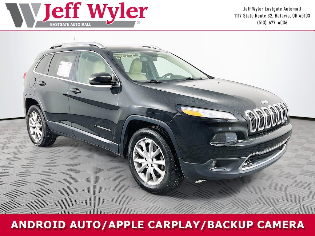 Jeff Wyler Eastgate Auto Mall is honored to offer this attractive 2018 Jeep Cherokee Limited in Diamond Black Crystal Pearlcoat. Well equipped with: Quick Order Package 21G, 3.734 Axle Ratio, 4-Wheel Disc Brakes, 6 Speakers, 600 Amp Maintenance Free Battery, 8.4" Touchscreen Display, ABS brakes, Active Grille Shutters, Air Conditioning, Alloy wheels, AM/FM radio: SiriusXM, Anti-whiplash front head restraints, Auto-dimming Rear-View mirror, Automatic temperature control, Auxiliary Transmission Oil Cooler, Brake assist, Bumpers: body-color, Compass, Delay-off headlights, Driver door bin, Driver vanity mirror, Dual front impact airbags, Dual front side impact airbags, Electronic Range Select, Electronic Stability Control, Emergency communication system: Uconnect Access, Engine Oil Cooler, Exterior Mirrors Courtesy Lamps, Exterior Mirrors w/Supplemental Signals, Four wheel independent suspension, Front anti-roll bar, Front Bucket Seats, Front Center Armrest, Front dual zone A/C, Front fog lights, Front reading lights, Fully automatic headlights, Garage door transmitter, GPS Antenna Input, Heated door mirrors, Heated front seats, Heated steering wheel, High intensity discharge headlights: Bi-Xenon, Illuminated entry, Integrated Voice Command w/Bluetooth, Knee airbag, Leather Shift Knob, Leather Trimmed Bucket Seats, Low tire pressure warning, Normal Duty Suspension, Occupant sensing airbag, Outside temperature display, Overhead airbag, Overhead console, Panic alarm, ParkView Rear Back-Up Camera, Passenger door bin, Passenger vanity mirror, Power door mirrors, Power driver seat, Power Liftgate, Power steering, Power windows, Radio data system, Radio: Uconnect 3C w/8.4" Display, Rear anti-roll bar, Rear reading lights, Rear seat center armrest, Rear side impact airbag, Rear window defroster, Rear window wiper, Remote keyless entry, Roof rack: rails only, Security system, SiriusXM Satellite Radio, Speed control, Speed-sensing steering, Split folding rear seat, Spoiler, Steering wheel mounted audio controls, Tachometer, Telescoping steering wheel, Tilt steering wheel, Traction control, Trip computer, Turn signal indicator mirrors, Uconnect Access, Variably intermittent wipers, Voltmeter, and Wheels: 18" x 7" Painted Aluminum. Clean CARFAX. Awards: * 2018 KBB.com 10 Most Awarded Brands Ask about available certifications. Used vehicles 10 years of age or newer with less than 100,000 miles are eligible for the Wyler Assurance Program, but eligible vehicles must pass our reconditioning process and multi-point inspection. Provided the vehicle passes inspection, vehicles will be eligible for the 6 month/6,000 mile limited warranty. The 6 month/6,000 mile limited warranty is NOT available on AS-IS vehicles, wholesale vehicles, lease buyback/pass-thru vehicles or un-inspected vehicles. Note that this program can also apply to vehicles where the remaining factory coverage is less than 6 months or 6,000 miles. Please check the Federal Trade Commission (FTC) Buyers guide on the vehicle for full details as to whether or not warranty coverage may apply. Contact Dealer for additional details. The Wyler Assurance 6 month/6,000 Mile limited warranty ends 6 months from the date of the Retail Purchase Agreement (BUYERS ORDER) or when the vehicle's odometer registers 6,000 additional miles to the mileage listed on the BUYERS ORDER, whichever comes first. Your Deductible - The warranty holder on your contract pays the first $100 of each covered repair.