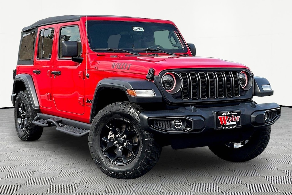 Jeff Wyler Hyundai of Colerain is very proud to offer this charming-looking and fun 2022 Jeep Wrangler Unlimited Willys in Firecracker Red Clearcoat. Well equipped with: Quick Order Package 25K Willys Sport (4-Wheel Drive Swing Gate Decal, 97 MPH Vehicle Max Speed Calibration, Anti-Spin Differential Rear Axle, BF Goodrich Brand Tires, Black Grille, Black Trail Rated Badge, Deep Tint Sunscreen Windows, Matte Black Jeep Badge, Mold In Color Bumper w/Gloss Black, MOPAR All-Weather Floor Mats, Wheels: 17" x 7.5" Moab Black Aluminum, Willys, and Willys Hood Decal), 110 MPH Vehicle Max Speed Calibration, 3.45 Rear Axle Ratio, 4-Wheel Disc Brakes, 8 Speakers, ABS brakes, Air Conditioning, AM/FM radio, Apple CarPlay/Android Auto, Aux Battery, Brake assist, Cloth Low-Back Bucket Seats, Compass, Delay-off headlights, Driver door bin, Driver vanity mirror, Dual front impact airbags, Dual front side impact airbags, Electronic Stability Control, Emergency communication system: SiriusXM Guardian, Engine Oil Cooler, Front anti-roll bar, Front Bucket Seats, Front Center Armrest w/Storage, Front fog lights, Front reading lights, Integrated roll-over protection, Low tire pressure warning, Non-Lock Fuel Cap w/o Discriminator, Normal Duty Suspension, Occupant sensing airbag, Outside temperature display, ParkView Rear Back-Up Camera, Passenger door bin, Passenger vanity mirror, Power steering, Radio data system, Radio: Uconnect 4 w/7" Display, Rear anti-roll bar, Rear reading lights, Speed control, Split folding rear seat, Steering wheel mounted audio controls, Stop-Start Dual Battery System, Tachometer, Telescoping steering wheel, Tilt steering wheel, Traction control, Trip computer, Variably intermittent wipers, and Wheels: 17" x 7.5" Black Steel Styled. This sales price excludes tax, title, and dealer fees. While every reasonable effort is made to ensure the accuracy of this information, we are not responsible for any errors or omissions contained on these pages. Used vehicles 10 years of age or newer with less than 100,000 miles are eligible for the Wyler Assurance Program, but eligible vehicles must pass our reconditioning process and multi-point inspection. Provided the vehicle passes inspection, vehicles will be eligible for the 6 month/6,000 mile limited warranty. The 6 month/6,000 mile limited warranty is NOT available on AS-IS vehicles, wholesale vehicles, lease buyback/pass-thru vehicles or un-inspected vehicles. Note that this program can also apply to vehicles where the remaining factory coverage is less than 6 months or 6,000 miles. Please check the Federal Trade Commission (FTC) Buyers guide on the vehicle for full details as to whether or not warranty coverage may apply. Contact Dealer for additional details. The Wyler Assurance 6 month/6,000 Mile limited warranty ends 6 months from the date of the Retail Purchase Agreement (BUYERS ORDER) or when the vehicle's odometer registers 6,000 additional miles to the mileage listed on the BUYERS ORDER, whichever comes first.Your Deductible - The warranty holder on your contract pays the first $100 of each covered repair.