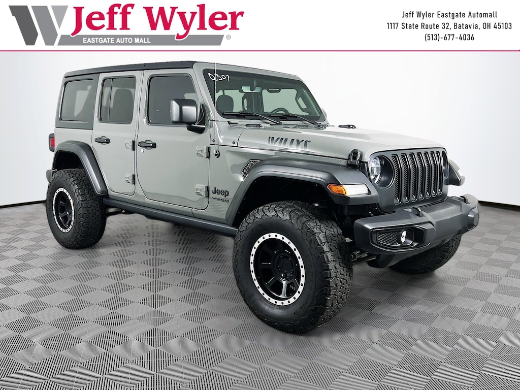 Jeff Wyler Eastgate Auto Mall is pumped up to offer this beautiful 2022 Jeep Wrangler Unlimited Willys in Sting-Gray Clearcoat. Well equipped with: 8.4" Radio & Premium Audio Group (1-Year SiriusXM Guardian Trial, 220 Amp Alternator, 4G LTE Wi-Fi Hot Spot, 5-Year SiriusXM Traffic Service, 5-Year SiriusXM Travel Link Service, 8.4" Touchscreen Display, Air Conditioning w/Auto Temperature Control, Air Filtering, Alpine Premium Audio System, Auto-Dimming Rear-View Mirror, Emergency/Assistance Call, GPS Navigation, HD Radio, Off-Road Info Pages, Radio: Uconnect 4C Nav w/8.4" Display, SiriusXM Radio Service, SiriusXM Satellite Radio, SiriusXM Traffic Plus, and SiriusXM Travel Link), Convenience Group (Universal Garage Door Opener), LED Headlamp & Fog Lamp Group (Front LED Fog Lamps and LED Premium Reflector Headlamps), Quick Order Package 26W Willys (4-Wheel Drive Swing Gate Decal, 97 MPH Vehicle Max Speed Calibration, Anti-Spin Differential Rear Axle, Automatic Headlamps, Black Grille, Black Trail Rated Badge, Deep Tint Sunscreen Windows, Front 1-Touch Down Power Windows, Leather Wrapped Steering Wheel, Matte Black Jeep Badge, Mold In Color Bumper w/Gloss Black, MOPAR All-Weather Floor Mats, Power Heated Mirrors, Remote Keyless Entry, Security Alarm, Speed Sensitive Power Locks, Sun Visors w/Illuminated Vanity Mirrors, Wheels: 17" x 7.5" Moab Black Aluminum, Willys, and Willys Hood Decal), Technology Group (2-Door Passive Entry, Front Door Locks and Cluster 7.0" TFT Color Display), Trailer Tow & HD Electrical Group (240 Amp Alternator, 7 & 4 Pin Wiring Harness, 700 Amp Maintenance Free Battery, Auxiliary Switches, and Class II Receiver Hitch), 110 MPH Vehicle Max Speed Calibration, 4-Wheel Disc Brakes, 8 Speakers, ABS brakes, Air Conditioning, AM/FM radio, Apple CarPlay/Android Auto, Aux Battery, Black 3-Piece Hard Top, Brake assist, Cloth Low-Back Bucket Seats, Compass, Delay-off headlights, Driver door bin, Driver vanity mirror, Dual front impact airbags, Dual front side impact airbags, Electronic Stability Control, Emergency communication system: SiriusXM Guardian, Engine Oil Cooler, Freedom Panel Storage Bag, Front anti-roll bar, Front Bucket Seats, Front Center Armrest w/Storage, Front fog lights, Front reading lights, Integrated roll-over protection, Low tire pressure warning, No Soft Top, Non-Lock Fuel Cap w/o Discriminator, Normal Duty Suspension, Occupant sensing airbag, Outside temperature display, ParkView Rear Back-Up Camera, Passenger door bin, Passenger vanity mirror, Power steering, Radio data system, Radio: Uconnect 4 w/7" Display, Rear anti-roll bar, Rear reading lights, Rear Window Defroster, Rear Window Wiper/Washer, Speed control, Split folding rear seat, Steering wheel mounted audio controls, Stop-Start Dual Battery System, Tachometer, Telescoping steering wheel, Tilt steering wheel, Traction control, Trip computer, Variably intermittent wipers, and Wheels: 17" x 7.5" Black Steel Styled. Clean CARFAX. Ask about available certifications. Used vehicles 10 years of age or newer with less than 100,000 miles are eligible for the Wyler Assurance Program, but eligible vehicles must pass our reconditioning process and multi-point inspection. Provided the vehicle passes inspection, vehicles will be eligible for the 6 month/6,000 mile limited warranty. The 6 month/6,000 mile limited warranty is NOT available on AS-IS vehicles, wholesale vehicles, lease buyback/pass-thru vehicles or un-inspected vehicles. Note that this program can also apply to vehicles where the remaining factory coverage is less than 6 months or 6,000 miles. Please check the Federal Trade Commission (FTC) Buyers guide on the vehicle for full details as to whether or not warranty coverage may apply. Contact Dealer for additional details. The Wyler Assurance 6 month/6,000 Mile limited warranty ends 6 months from the date of the Retail Purchase Agreement (BUYERS ORDER) or when the vehicle's odometer registers 6,000 additional miles to the mileage listed o