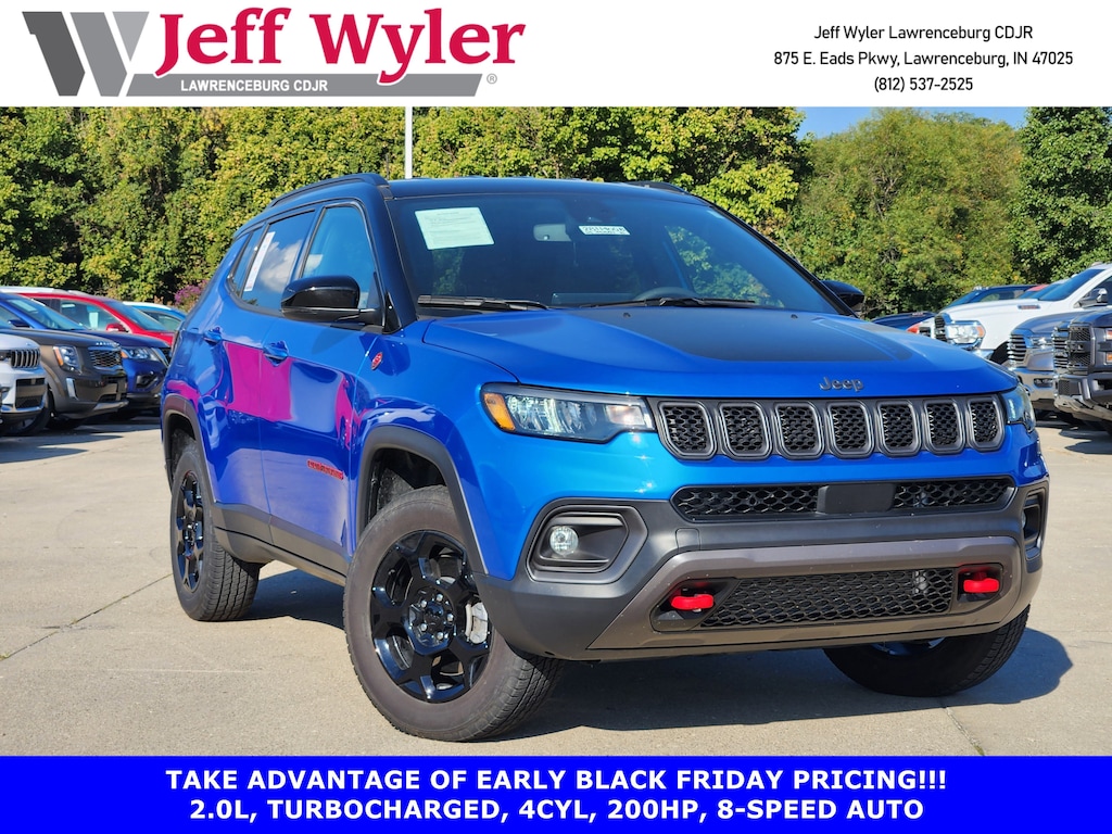 Jeff Wyler Chrysler Dodge Jeep of Lawrenceburg is excited to offer this good-looking 2024 Jeep Compass Trailhawk in Hydro Blue Pearlcoat. Quick Order Package 29E, Trailer Tow Group (4 Pin Wiring Harness and Class III Receiver Hitch), 4WD, 10.1" Touchscreen Display, 4-Wheel Disc Brakes, 4.398 Final Drive Ratio, 4G LTE Wi-Fi Hot Spot, 6 Speakers, ABS brakes, Air Conditioning, Alloy wheels, AM/FM radio: SiriusXM, Auto High-beam Headlights, Auto-dimming Rear-View mirror, Automatic temperature control, Brake assist, Bumpers: body-color, Compass, Delay-off headlights, Driver door bin, Driver vanity mirror, Dual front impact airbags, Dual front side impact airbags, Electronic Stability Control, Emergency communication system: Jeep Connect, For Details, Visit DriveUconnect.com, For More Info, Call 800-643-2112, Four wheel independent suspension, Front anti-roll bar, Front Bucket Seats, Front Center Armrest w/Storage, Front dual zone A/C, Front fog lights, Front reading lights, Fully automatic headlights, Global Telematics Box Module (TBM), Heated door mirrors, Illuminated entry, Knee airbag, Leather Shift Knob, Leather steering wheel, Low tire pressure warning, Occupant sensing airbag, Outside temperature display, Overhead airbag, Overhead console, Panic alarm, ParkView Rear Back-Up Camera, Passenger door bin, Passenger vanity mirror, Power door mirrors, Power steering, Power windows, Premium Cloth/Leather Trim Bucket Seats, Radio: Uconnect 5 w/10.1" Display, Rain sensing wipers, Rear anti-roll bar, Rear seat center armrest, Rear window defroster, Rear window wiper, Remote keyless entry, Security system, SiriusXM Guardian - Included Trial (B), SiriusXM Radio Service, Speed control, Split folding rear seat, Spoiler, Steering wheel mounted audio controls, Tachometer, Telescoping steering wheel, Tilt steering wheel, Traction control, Trip computer, Turn signal indicator mirrors, Variably intermittent wipers, and Wheels: 17" x 6.5" Painted Black Aluminum Our PRE-OWNED vehicles are put through a rigorous 167- POINT QUALITY ASSURANCE INSPECTION along with an average amount of over $1,400.00 SPENT to recondition each vehicle so we can be sure to deliver you the highest quality vehicle like you deserve! ***ONLINE PRICE DOES NOT INCLUDE WYLER FAMILY FIRST PACKAGE*** Stop by 4136 Shelbyville Road to see for yourself, or give us a call @ 502-897-3151 to schedule your test drive! Ask about available certifications.