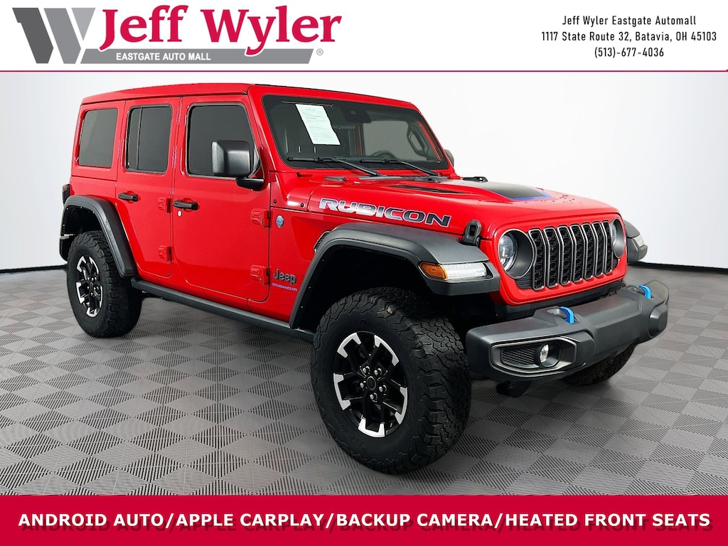 Jeff Wyler Eastgate Auto Mall is pumped up to offer this fantastic 2024 Jeep Wrangler Rubicon 4xe in Firecracker Red Clearcoat. Well equipped with: Convenience Group (Heated Front Seats, Heated Steering Wheel, Remote Start System, and Universal Garage Door Opener), Quick Order Package 29V Rubicon, Safety Group (Auto High Beam Headlamp Control, Blind Spot & Cross Path Detection, and ParkSense Rear Park Assist System), 12.3" Touchscreen Display, 4-Wheel Disc Brakes, 4G LTE Wi-Fi Hot Spot, 8 Speakers, ABS brakes, Air Conditioning, Alloy wheels, AM/FM radio: SiriusXM, Apple CarPlay, Apple CarPlay/Android Auto, Automatic temperature control, Brake assist, Compass, Connectivity - US/Canada, Delay-off headlights, Disassociated Touchscreen Display, Driver door bin, Driver vanity mirror, Dual front impact airbags, Dual front side impact airbags, Electronic Stability Control, Emergency communication system: Jeep Connect, Front anti-roll bar, Front Bucket Seats, Front Center Armrest w/Storage, Front dual zone A/C, Front fog lights, Front reading lights, Fully automatic headlights, Google Android Auto, Heated door mirrors, Illuminated entry, Integrated Center Stack Radio, Integrated roll-over protection, Integrated Voice Command w/Bluetooth, Low tire pressure warning, Occupant sensing airbag, Outside temperature display, Overhead airbag, Panic alarm, ParkView Rear Back-Up Camera, Passenger door bin, Passenger vanity mirror, Performance Suspension, Power door mirrors, Power steering, Power Top Quarter Window Storage Bag, Power windows, Radio data system, Radio: Uconnect 5 w/12.3" Display, Rear anti-roll bar, Rear reading lights, Rear Window Defroster, Rear Window Wiper/Washer, Remote keyless entry, Removable Rear Quarter Windows, Security system, Sky 1-Touch Power Top, Speed control, Split folding rear seat, Steering wheel mounted audio controls, Sustainable Premium Cloth Seats, Tachometer, Telescoping steering wheel, Tilt steering wheel, Traction control, Trip computer, Variably intermittent wipers, Voltmeter, and Wheels: 17" x 7.5" Machined w/Black Pockets. CARFAX One-Owner. Ask about available certifications. Used vehicles 10 years of age or newer with less than 100,000 miles are eligible for the Wyler Assurance Program, but eligible vehicles must pass our reconditioning process and multi-point inspection. Provided the vehicle passes inspection, vehicles will be eligible for the 6 month/6,000 mile limited warranty. The 6 month/6,000 mile limited warranty is NOT available on AS-IS vehicles, wholesale vehicles, lease buyback/pass-thru vehicles or un-inspected vehicles. Note that this program can also apply to vehicles where the remaining factory coverage is less than 6 months or 6,000 miles. Please check the Federal Trade Commission (FTC) Buyers guide on the vehicle for full details as to whether or not warranty coverage may apply. Contact Dealer for additional details. The Wyler Assurance 6 month/6,000 Mile limited warranty ends 6 months from the date of the Retail Purchase Agreement (BUYERS ORDER) or when the vehicle's odometer registers 6,000 additional miles to the mileage listed on the BUYERS ORDER, whichever comes first. Your Deductible - The warranty holder on your contract pays the first $100 of each covered repair.