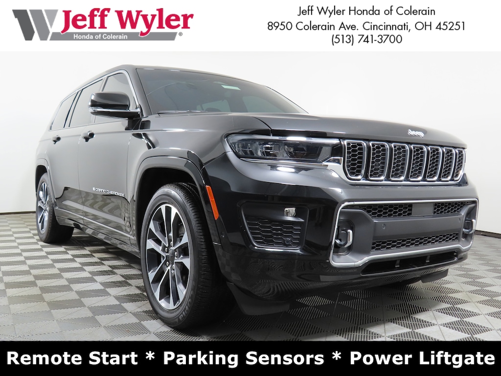 Jeff Wyler Honda of Colerain is excited to offer this superb-looking 2025 Jeep Grand Cherokee L Overland in Diamond Black Crystal Pearlcoat. Well equipped with: Luxury Tech Group IV (2nd Row Manual Window Shades, Driver Power Seat Back Massage, Front Passenger Power Seat Back Massage, Nappa Leather Seats, Passenger Seat Memory, Power Adjust 12-Way Driver Seat, Power Adjust 12-Way Front Passenger Seat, Rearview Autodim Digital Display Mirror, and Wireless Charging Pad), Quick Order Package 23N, 10 Speakers, 2nd Row 60/40 Bench with Manual Tip/Slide, 2nd Row Seat Center Armrest/Cupholders, 3 Rear Seat Head Restraints, 3.45 Rear Axle Ratio, 3rd row seats: split-bench, 4-Wheel Disc Brakes, 7-Passenger Seating, ABS brakes, Adaptive suspension, Air Conditioning, Alloy wheels, AM/FM radio: SiriusXM with 360L, Anti-whiplash front head restraints, Audio memory, Auto High-beam Headlights, Auto-dimming door mirrors, Auto-dimming Rear-View mirror, Auto-leveling suspension, Automatic temperature control, Brake assist, Bumpers: body-color, Center Rear 3-Point Seat Belt, Compass, Delay-off headlights, Driver door bin, Driver vanity mirror, Dual front impact airbags, Dual front side impact airbags, Electronic Stability Control, Emergency communication system, Four wheel independent suspension, Front anti-roll bar, Front Bucket Seats, Front Center Armrest w/Storage, Front dual zone A/C, Front fog lights, Front reading lights, Fully automatic headlights, Garage door transmitter, Heated door mirrors, Heated front seats, Heated rear seats, Heated steering wheel, Illuminated entry, Knee airbag, Low tire pressure warning, Memory seat, Model Year Tracking, Navigation System, Normal Duty Suspension, Occupant sensing airbag, Outside temperature display, Overhead airbag, Overhead console, Panic alarm, Passenger door bin, Passenger vanity mirror, Power door mirrors, Power driver seat, Power Fold Seatbacks, Power Liftgate, Power moonroof, Power passenger seat, Power steering, Power windows, Radio data system, Radio: Uconnect 5 Nav with 10.1" Display, Rain sensing wipers, Rear air conditioning, Rear anti-roll bar, Rear reading lights, Rear window defroster, Rear window wiper, Reclining 3rd row seat, Remote keyless entry, Security system, Speed control, Speed-Sensitive Wipers, Split folding rear seat, Spoiler, Steering wheel memory, Steering wheel mounted audio controls, Tachometer, Telescoping steering wheel, Tilt steering wheel, Traction control, Trip computer, Turn signal indicator mirrors, Variably intermittent wipers, Ventilated front seats, Voltmeter, and Wheels: 20" x 8.5" Machined Face Aluminum.