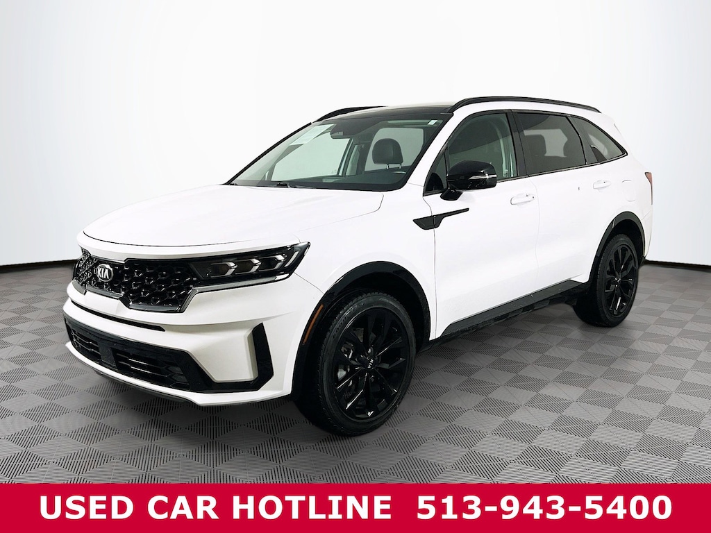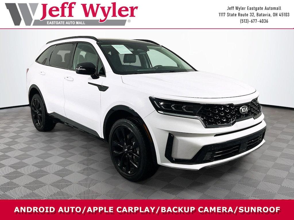 Jeff Wyler Eastgate Auto Mall is proud to offer this fantastic-looking 2021 Kia Sorento SX in Glacial White Pearl. Well equipped with: 3.316 Axle Ratio, 3rd row seats: split-bench, 4-Wheel Disc Brakes, 6 Speakers, ABS brakes, Air Conditioning, Alloy wheels, AM/FM radio: SiriusXM, Apple CarPlay & Android Auto, Auto High-beam Headlights, Automatic temperature control, Brake assist, Bumpers: body-color, Carpeted Floor Mats, Delay-off headlights, Driver door bin, Driver vanity mirror, Dual front impact airbags, Dual front side impact airbags, Electronic Stability Control, Emergency communication system: UVO link, Exterior Parking Camera Rear, Four wheel independent suspension, Front anti-roll bar, Front Bucket Seats, Front Center Armrest, Front dual zone A/C, Front fog lights, Front reading lights, Fully automatic headlights, Heated door mirrors, Heated Front Bucket Seats, Heated front seats, Illuminated entry, Knee airbag, Leather steering wheel, Low tire pressure warning, Navigation System, Occupant sensing airbag, Outside temperature display, Overhead airbag, Overhead console, Panic alarm, Passenger door bin, Passenger vanity mirror, Power door mirrors, Power driver seat, Power Liftgate, Power moonroof, Power passenger seat, Power steering, Power windows, Premium Leatherette Seat Trim, Radio data system, Radio: AM/FM Audio System w/Navigation, Rear air conditioning, Rear anti-roll bar, Rear reading lights, Rear window defroster, Rear window wiper, Remote keyless entry, Roof rack: rails only, Security system, Smart Key w/ Push Button and Remote Start, Speed control, Speed-sensing steering, Split folding rear seat, Spoiler, Steering wheel mounted audio controls, Tachometer, Telescoping steering wheel, Tilt steering wheel, Traction control, Trip computer, Turn signal indicator mirrors, Variably intermittent wipers, and Wheels: 20" Gloss Black Alloy. CARFAX One-Owner. Clean CARFAX. Ask about available certifications. Used vehicles 10 years of age or newer with less than 100,000 miles are eligible for the Wyler Assurance Program, but eligible vehicles must pass our reconditioning process and multi-point inspection. Provided the vehicle passes inspection, vehicles will be eligible for the 6 month/6,000 mile limited warranty. The 6 month/6,000 mile limited warranty is NOT available on AS-IS vehicles, wholesale vehicles, lease buyback/pass-thru vehicles or un-inspected vehicles. Note that this program can also apply to vehicles where the remaining factory coverage is less than 6 months or 6,000 miles. Please check the Federal Trade Commission (FTC) Buyers guide on the vehicle for full details as to whether or not warranty coverage may apply. Contact Dealer for additional details. The Wyler Assurance 6 month/6,000 Mile limited warranty ends 6 months from the date of the Retail Purchase Agreement (BUYERS ORDER) or when the vehicle's odometer registers 6,000 additional miles to the mileage listed on the BUYERS ORDER, whichever comes first. Your Deductible - The warranty holder on your contract pays the first $100 of each covered repair.