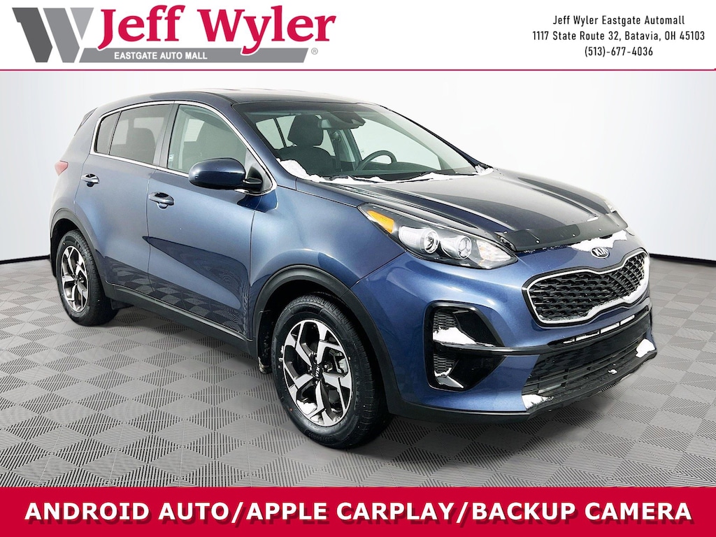Jeff Wyler Eastgate Auto Mall is proud to offer this outstanding-looking 2021 Kia Sportage LX in Pacific Blue. Well equipped with: 17" Machine-Finished Alloy Wheels, 4-Wheel Disc Brakes, 6 Speakers, 6-Way Adjustable Driver's Seat, ABS brakes, Air Conditioning, Alloy wheels, AM/FM radio, Apple CarPlay & Android Auto, Auto High-beam Headlights, Axle Ratio: 3.064, Brake assist, Bumpers: body-color, Carpet Floor Mats, Cloth Seat Trim, Delay-off headlights, Driver door bin, Driver vanity mirror, Dual front impact airbags, Dual front side impact airbags, Electronic Stability Control, Exterior Parking Camera Rear, Four wheel independent suspension, Front anti-roll bar, Front Bucket Seats, Front Center Armrest, Front reading lights, Fully automatic headlights, Illuminated entry, Low tire pressure warning, Mud Guards, Occupant sensing airbag, Outside temperature display, Overhead airbag, Overhead console, Panic alarm, Passenger door bin, Passenger vanity mirror, Power door mirrors, Power steering, Power windows, Radio: AM/FM Audio System, Rear anti-roll bar, Rear seat center armrest, Rear window defroster, Rear window wiper, Remote keyless entry, Security system, Speed control, Speed-sensing steering, Split folding rear seat, Spoiler, Steering wheel mounted audio controls, Tachometer, Telescoping steering wheel, Tilt steering wheel, Traction control, Trip computer, and Variably intermittent wipers. CARFAX One-Owner. Awards: * JD Power Initial Quality Study (IQS) Ask about available certifications. Used vehicles 10 years of age or newer with less than 100,000 miles are eligible for the Wyler Assurance Program, but eligible vehicles must pass our reconditioning process and multi-point inspection. Provided the vehicle passes inspection, vehicles will be eligible for the 6 month/6,000 mile limited warranty. The 6 month/6,000 mile limited warranty is NOT available on AS-IS vehicles, wholesale vehicles, lease buyback/pass-thru vehicles or un-inspected vehicles. Note that this program can also apply to vehicles where the remaining factory coverage is less than 6 months or 6,000 miles. Please check the Federal Trade Commission (FTC) Buyers guide on the vehicle for full details as to whether or not warranty coverage may apply. Contact Dealer for additional details. The Wyler Assurance 6 month/6,000 Mile limited warranty ends 6 months from the date of the Retail Purchase Agreement (BUYERS ORDER) or when the vehicle's odometer registers 6,000 additional miles to the mileage listed on the BUYERS ORDER, whichever comes first. Your Deductible - The warranty holder on your contract pays the first $100 of each covered repair.