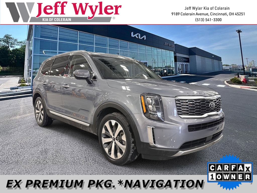Jeff Wyler Kia of Colerain is pleased to offer this handsome 2021 Kia Telluride EX in Everlasting Silver. EX Premium Package (2nd Row Captain Chairs, LED Headlamps, Satin Chrome Roof Rails, and Wheels: 7.5" x 20" Machined Finish Alloy), 3.648 Axle Ratio, 3rd row seats: split-bench, 4-Wheel Disc Brakes, 6 Speakers, ABS brakes, Air Conditioning, Alloy wheels, AM/FM radio: SiriusXM, Apple CarPlay & Android Auto, Auto-dimming Rear-View mirror, Automatic temperature control, Brake assist, Bumpers: body-color, Cargo Net, Carpeted Floor Mats, Compass, Delay-off headlights, Driver door bin, Driver vanity mirror, Dual front impact airbags, Dual front side impact airbags, Electronic Stability Control, Emergency communication system: 911 Connect, Four wheel independent suspension, Front anti-roll bar, Front Bucket Seats, Front Center Armrest, Front dual zone A/C, Front reading lights, Fully automatic headlights, Heated & Ventilated Front Bucket Seats, Heated door mirrors, Heated front seats, Illuminated entry, Knee airbag, Leather Seat Trim, Leather Shift Knob, Leather steering wheel, Low tire pressure warning, Navigation System, Occupant sensing airbag, Outside temperature display, Overhead airbag, Overhead console, Panic alarm, Passenger door bin, Passenger vanity mirror, Power door mirrors, Power driver seat, Power Liftgate, Power moonroof, Power passenger seat, Power steering, Power windows, Radio data system, Radio: AM/FM/SIRIUS Display Audio, Rear air conditioning, Rear anti-roll bar, Rear audio controls, Rear reading lights, Rear seat center armrest, Rear window defroster, Rear window wiper, Reclining 3rd row seat, Remote keyless entry, Roof rack: rails only, Security system, Smart Key w/ Push Button and Remote Start, Speed control, Speed-sensing steering, Split folding rear seat, Spoiler, Steering wheel mounted audio controls, Tachometer, Telescoping steering wheel, Tilt steering wheel, Traction control, Trip computer, Turn signal indicator mirrors, Variably intermittent wipers, Ventilated front seats, Wheel Locks, and Wheels: 7.5" x 18" Machined Finish Alloy Our PRE-OWNED vehicles are put through a rigorous 167- POINT QUALITY ASSURANCE INSPECTION along with an average amount of over $1,400.00 SPENT to recondition each vehicle so we can be sure to deliver you the highest quality vehicle like you deserve! ***ONLINE PRICE DOES NOT INCLUDE WYLER FAMILY FIRST PACKAGE***