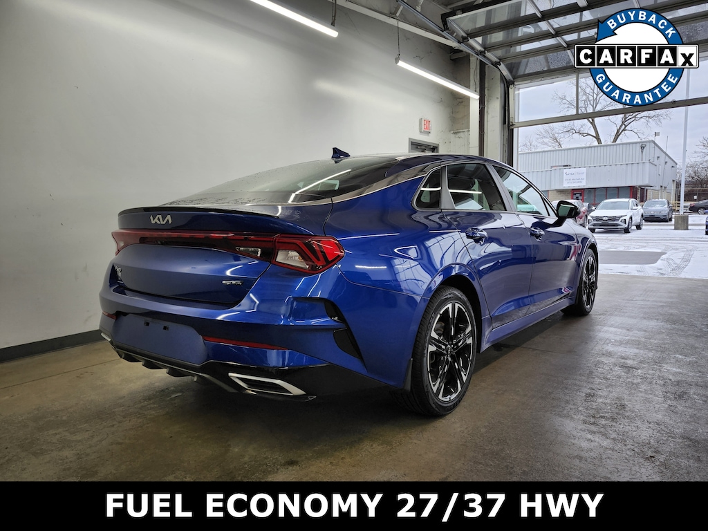 Jeff Wyler Superior Hyundai is delighted to offer this charming 2022 Kia K5 GT-Line in Sapphire Blue. Well equipped with: 4-Wheel Disc Brakes, 6 Speakers, ABS brakes, Air Conditioning, Alloy wheels, AM/FM radio: SiriusXM, Apple CarPlay & Android Auto, Auto High-beam Headlights, Automatic temperature control, Brake assist, Bumpers: body-color, Cargo Tray, Carpeted Floor Mats, Cloth/Leatherette Seat Trim, Delay-off headlights, Driver door bin, Driver vanity mirror, Dual front impact airbags, Dual front side impact airbags, Electronic Stability Control, Four wheel independent suspension, Front anti-roll bar, Front Bucket Seats, Front Center Armrest, Front dual zone A/C, Front fog lights, Front reading lights, Fully automatic headlights, Heated door mirrors, Illuminated entry, Knee airbag, Low tire pressure warning, Navigation System, Occupant sensing airbag, Outside temperature display, Overhead airbag, Overhead console, Panic alarm, Passenger door bin, Passenger vanity mirror, Power door mirrors, Power driver seat, Power steering, Power windows, Radio data system, Radio: AM/FM/MP3 Audio System, Rear anti-roll bar, Rear seat center armrest, Rear side impact airbag, Rear window defroster, Remote keyless entry, Security system, Speed control, Speed-sensing steering, Split folding rear seat, Spoiler, Sport steering wheel, Steering wheel mounted audio controls, Tachometer, Telescoping steering wheel, Tilt steering wheel, Traction control, Trip computer, Turn signal indicator mirrors, Variably intermittent wipers, Wheel Locks, and Wheels: 7.5J x 18" Gloss Black Machined Finish Alloy. This sales price excludes tax, title, and dealer fees. While every reasonable effort is made to ensure the accuracy of this information, we are not responsible for any errors or omissions contained on these pages. Used vehicles 10 years of age or newer with less than 100,000 miles are eligible for the Wyler Assurance Program, but eligible vehicles must pass our reconditioning process and multi-point inspection. Provided the vehicle passes inspection, vehicles will be eligible for the 6 month/6,000 mile limited warranty. The 6 month/6,000 mile limited warranty is NOT available on AS-IS vehicles, wholesale vehicles, lease buyback/pass-thru vehicles or un-inspected vehicles. Note that this program can also apply to vehicles where the remaining factory coverage is less than 6 months or 6,000 miles. Please check the Federal Trade Commission (FTC) Buyers guide on the vehicle for full details as to whether or not warranty coverage may apply. Contact Dealer for additional details. The Wyler Assurance 6 month/6,000 Mile limited warranty ends 6 months from the date of the Retail Purchase Agreement (BUYERS ORDER) or when the vehicle's odometer registers 6,000 additional miles to the mileage listed on the BUYERS ORDER, whichever comes first.Your Deductible - The warranty holder on your contract pays the first $100 of each covered repair.