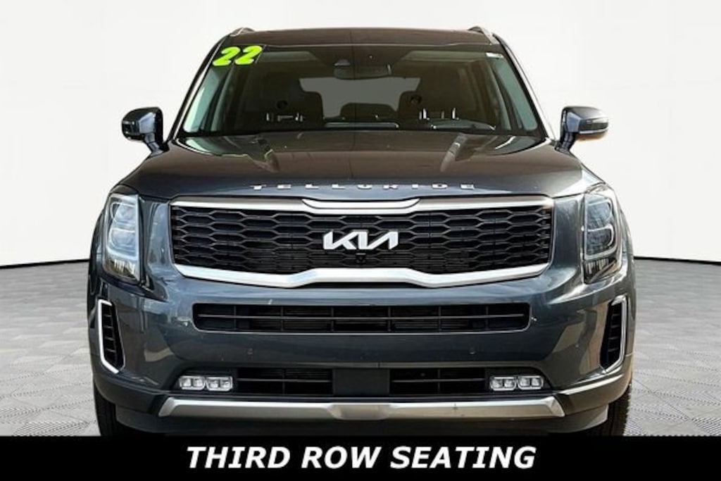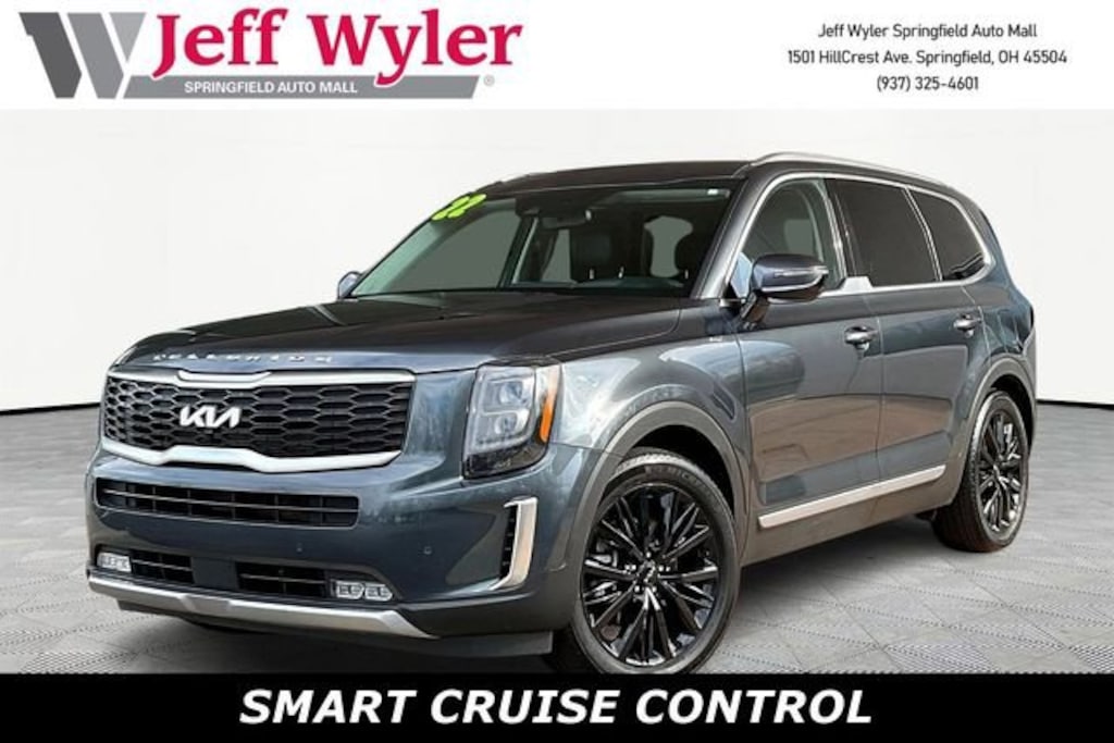 Jeff Wyler Springfield Auto Mall is pumped up to offer this great-looking 2022 Kia Telluride SX in Gravity Gray. Well equipped with: SX Prestige Package (110V Inverter, Heads-Up Display, Heated & Ventilated 2nd Row Seats, Premium Cloth Headliner & Pillar Trim, Premium Nappa Leather Seat Trim, and Rain-Sensing Front Windshield Wipers), Towing Package (Self Leveling Rear Suspension and Tow Hitch w/Harness (TOF)), 10 Speakers, 3.648 Axle Ratio, 3rd row seats: split-bench, 4-Wheel Disc Brakes, ABS brakes, Air Conditioning, Alloy wheels, AM/FM radio: SiriusXM, Apple CarPlay & Android Auto, Auto High-beam Headlights, Auto-dimming Rear-View mirror, Automatic temperature control, Brake assist, Bumpers: body-color, Cargo Cover, Carpeted Floor Mats, Chrome Wheel Lock (DISC), Compass, Delay-off headlights, Driver door bin, Driver vanity mirror, Dual front impact airbags, Dual front side impact airbags, Electronic Stability Control, Emergency communication system: 911 Connect, Four wheel independent suspension, Front anti-roll bar, Front Bucket Seats, Front Center Armrest, Front dual zone A/C, Front fog lights, Front reading lights, Fully automatic headlights, Garage door transmitter: HomeLink, harman/kardon® Speakers, Heated & Ventilated Front Bucket Seats, Heated door mirrors, Heated front seats, Heated steering wheel, Hybrid Cargo Net, Illuminated entry, Knee airbag, Leather Seat Trim, Leather Shift Knob, Leather steering wheel, Low tire pressure warning, Memory seat, Navigation System, Occupant sensing airbag, Outside temperature display, Overhead airbag, Overhead console, Panic alarm, Passenger door bin, Passenger vanity mirror, Power door mirrors, Power driver seat, Power Liftgate, Power moonroof, Power passenger seat, Power steering, Power windows, Radio data system, Radio: AM/FM harman/kardon Audio System, Rear air conditioning, Rear anti-roll bar, Rear audio controls, Rear reading lights, Rear window defroster, Rear window wiper, Reclining 3rd row seat, Remote keyless entry, Roof rack: rails only, Security system, Smart Key w/ Push Button and Remote Start, Speed control, Speed-sensing steering, Split folding rear seat, Spoiler, Steering wheel mounted audio controls, Tachometer, Telescoping steering wheel, Tilt steering wheel, Traction control, Trip computer, Turn signal indicator mirrors, Variably intermittent wipers, Ventilated front seats, and Wheels: 20 x 7.5 Black Alloy. Ask about available certifications. Used vehicles 10 years of age or newer with less than 100,000 miles are eligible for the Wyler Assurance Program, but eligible vehicles must pass our reconditioning process and multi-point inspection. Provided the vehicle passes inspection, vehicles will be eligible for the 6 month/6,000 mile limited warranty. The 6 month/6,000 mile limited warranty is NOT available on AS-IS vehicles, wholesale vehicles, lease buyback/pass-thru vehicles or un-inspected vehicles. Note that this program can also apply to vehicles where the remaining factory coverage is less than 6 months or 6,000 miles. Please check the Federal Trade Commission (FTC) Buyers guide on the vehicle for full details as to whether or not warranty coverage may apply. Contact Dealer for additional details. The Wyler Assurance 6 month/6,000 Mile limited warranty ends 6 months from the date of the Retail Purchase Agreement (BUYERS ORDER) or when the vehicle's odometer registers 6,000 additional miles to the mileage listed on the BUYERS ORDER, whichever comes first. Your Deductible - The warranty holder on your contract pays the first $100 of each covered repair.