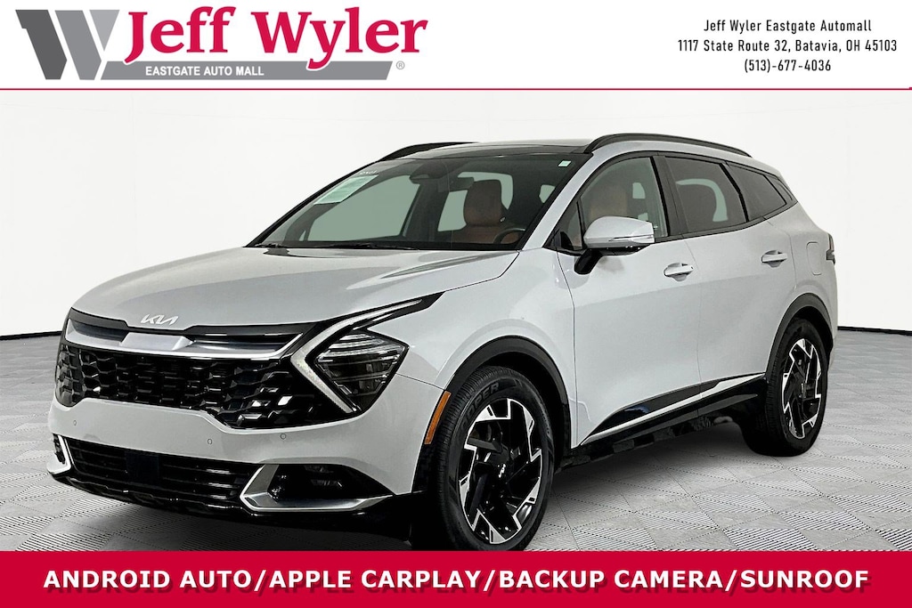 Jeff Wyler Eastgate Auto Mall is honored to offer this attractive-looking 2023 Kia Sportage SX-Prestige in Wolf Gray. Well equipped with: Carmine Red Interior Color Package, 4-Wheel Disc Brakes, 8 Speakers, ABS brakes, Air Conditioning, Alloy wheels, AM/FM radio: SiriusXM, Apple CarPlay & Android Auto, Auto High-beam Headlights, Auto-dimming Rear-View mirror, Automatic temperature control, Axle Ratio: 3.648, Brake assist, Bumpers: body-color, Carpeted Floor Mats, Compass, Delay-off headlights, Driver door bin, Driver vanity mirror, Dual front impact airbags, Dual front side impact airbags, Electronic Stability Control, Emergency communication system, Four wheel independent suspension, Front anti-roll bar, Front Bucket Seats, Front Center Armrest, Front dual zone A/C, Front fog lights, Front reading lights, Fully automatic headlights, Garage door transmitter: HomeLink, harman/kardon® Speakers, Heated & Ventilated Front Bucket Seats, Heated door mirrors, Heated front seats, Heated steering wheel, Illuminated entry, Leather Shift Knob, Leather steering wheel, Low tire pressure warning, Memory seat, Navigation System, Occupant sensing airbag, Outside temperature display, Overhead airbag, Overhead console, Panic alarm, Passenger door bin, Passenger vanity mirror, Power door mirrors, Power driver seat, Power Liftgate, Power moonroof, Power passenger seat, Power steering, Power windows, Premium Leatherette Seat Trim, Radio: AM/FM/HD Audio System, Rain sensing wipers, Rear anti-roll bar, Rear reading lights, Rear seat center armrest, Rear window defroster, Rear window wiper, Remote keyless entry, Security system, Speed control, Speed-sensing steering, Split folding rear seat, Spoiler, Steering wheel mounted audio controls, Tachometer, Telescoping steering wheel, Tilt steering wheel, Traction control, Trip computer, Turn signal indicator mirrors, Variably intermittent wipers, Ventilated front seats, and Wheels: 19" Gloss Black Alloy. CARFAX One-Owner. Clean CARFAX. Ask about available certifications. Used vehicles 10 years of age or newer with less than 100,000 miles are eligible for the Wyler Assurance Program, but eligible vehicles must pass our reconditioning process and multi-point inspection. Provided the vehicle passes inspection, vehicles will be eligible for the 6 month/6,000 mile limited warranty. The 6 month/6,000 mile limited warranty is NOT available on AS-IS vehicles, wholesale vehicles, lease buyback/pass-thru vehicles or un-inspected vehicles. Note that this program can also apply to vehicles where the remaining factory coverage is less than 6 months or 6,000 miles. Please check the Federal Trade Commission (FTC) Buyers guide on the vehicle for full details as to whether or not warranty coverage may apply. Contact Dealer for additional details. The Wyler Assurance 6 month/6,000 Mile limited warranty ends 6 months from the date of the Retail Purchase Agreement (BUYERS ORDER) or when the vehicle's odometer registers 6,000 additional miles to the mileage listed on the BUYERS ORDER, whichever comes first. Your Deductible - The warranty holder on your contract pays the first $100 of each covered repair.