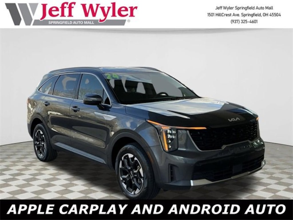 Jeff Wyler Springfield Auto Mall is proud to offer this beautiful 2024 Kia Sorento S in Gravity Gray. Well equipped with: 3rd row seats: split-bench, 4-Wheel Disc Brakes, 4.081 Axle Ratio, 6 Speakers, ABS brakes, Air Conditioning, Alloy wheels, AM/FM radio: SiriusXM, Apple CarPlay & Android Auto, Auto High-beam Headlights, Automatic temperature control, Brake assist, Bumpers: body-color, Carpeted Floor Mats, Delay-off headlights, Driver door bin, Driver vanity mirror, Dual front impact airbags, Dual front side impact airbags, Electronic Stability Control, Emergency communication system: 911 Connect, Exterior Parking Camera Rear, Four wheel independent suspension, Front anti-roll bar, Front Bucket Seats, Front Center Armrest, Front dual zone A/C, Front fog lights, Front reading lights, Fully automatic headlights, Heated door mirrors, Heated Front Bucket Seats, Heated front seats, Illuminated entry, Knee airbag, Leather Shift Knob, Leather steering wheel, Low tire pressure warning, Navigation System, Occupant sensing airbag, Outside temperature display, Overhead airbag, Overhead console, Panic alarm, Passenger door bin, Passenger vanity mirror, Power door mirrors, Power driver seat, Power steering, Power windows, Radio data system, Radio: AM/FM Audio System, Rear anti-roll bar, Rear reading lights, Rear seat center armrest, Rear side impact airbag, Rear window defroster, Rear window wiper, Remote keyless entry, Security system, Smart Key w/ Push Button and Remote Start, Speed control, Speed-sensing steering, Split folding rear seat, Spoiler, Steering wheel mounted audio controls, SynTex Artificial Leather Seat Trim, Tachometer, Telescoping steering wheel, Tilt steering wheel, Traction control, Trip computer, Turn signal indicator mirrors, Variably intermittent wipers, and Wheels: 7.5J x 18 Alloy w/Machine Finish. Ask about available certifications. Used vehicles 10 years of age or newer with less than 100,000 miles are eligible for the Wyler Assurance Program, but eligible vehicles must pass our reconditioning process and multi-point inspection. Provided the vehicle passes inspection, vehicles will be eligible for the 6 month/6,000 mile limited warranty. The 6 month/6,000 mile limited warranty is NOT available on AS-IS vehicles, wholesale vehicles, lease buyback/pass-thru vehicles or un-inspected vehicles. Note that this program can also apply to vehicles where the remaining factory coverage is less than 6 months or 6,000 miles. Please check the Federal Trade Commission (FTC) Buyers guide on the vehicle for full details as to whether or not warranty coverage may apply. Contact Dealer for additional details. The Wyler Assurance 6 month/6,000 Mile limited warranty ends 6 months from the date of the Retail Purchase Agreement (BUYERS ORDER) or when the vehicle's odometer registers 6,000 additional miles to the mileage listed on the BUYERS ORDER, whichever comes first. Your Deductible - The warranty holder on your contract pays the first $100 of each covered repair.