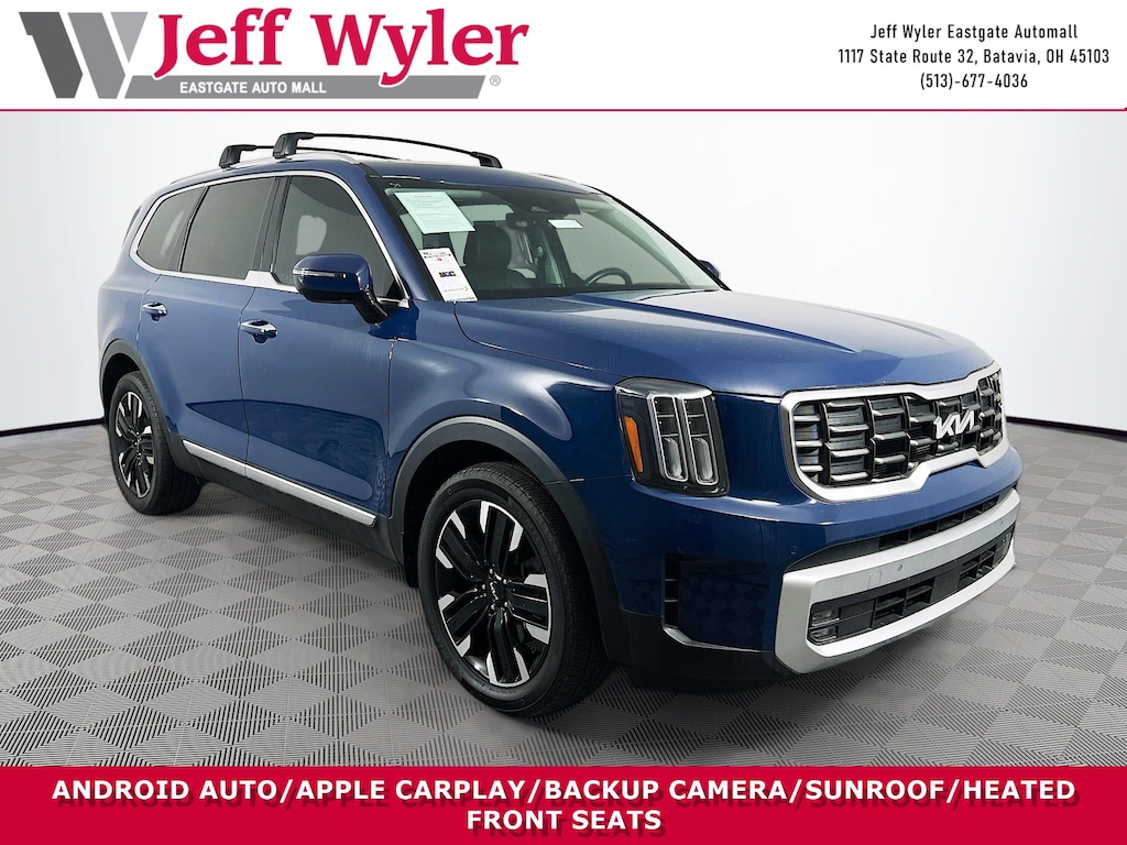 Jeff Wyler Eastgate Auto Mall is delighted to offer this wonderful-looking 2024 Kia Telluride SX-Prestige in Midnight Lake Blue. Well equipped with: 10 Speakers, 3.648 Axle Ratio, 3rd row seats: split-bench, 4-Wheel Disc Brakes, ABS brakes, Air Conditioning, Alloy wheels, AM/FM radio: SiriusXM, Apple CarPlay & Android Auto, Auto High-beam Headlights, Auto-dimming Rear-View mirror, Automatic temperature control, Brake assist, Bumpers: body-color, Carpet Floor Mats, Compass, Delay-off headlights, Driver door bin, Driver vanity mirror, Dual front impact airbags, Dual front side impact airbags, Electronic Stability Control, Emergency communication system: 911 Connect, Exterior Parking Camera Rear, Four wheel independent suspension, Front anti-roll bar, Front Bucket Seats, Front Center Armrest, Front dual zone A/C, Front fog lights, Front reading lights, Fully automatic headlights, Garage door transmitter: HomeLink, harman/kardon® Speakers, Heated & Ventilated Front Bucket Seats, Heated door mirrors, Heated front seats, Heated steering wheel, Illuminated entry, Knee airbag, Leather Shift Knob, Leather steering wheel, Low tire pressure warning, Memory seat, Navigation System, Occupant sensing airbag, Outside temperature display, Overhead airbag, Overhead console, Panic alarm, Passenger door bin, Passenger vanity mirror, Power door mirrors, Power driver seat, Power Liftgate, Power moonroof, Power passenger seat, Power steering, Power windows, Radio data system, Radio: AM/FM Harman Kardon Audio System, Rear air conditioning, Rear anti-roll bar, Rear audio controls, Rear reading lights, Rear side impact airbag, Rear window defroster, Rear window wiper, Reclining 3rd row seat, Remote keyless entry, Roof rack: rails only, Security system, Smart Key w/ Push Button and Remote Start, Speed control, Speed-sensing steering, Split folding rear seat, Spoiler, Steering wheel mounted audio controls, Tachometer, Telescoping steering wheel, Tilt steering wheel, Traction control, Trip computer, Turn signal indicator mirrors, Variably intermittent wipers, and Ventilated front seats. CARFAX One-Owner. Ask about available certifications. Used vehicles 10 years of age or newer with less than 100,000 miles are eligible for the Wyler Assurance Program, but eligible vehicles must pass our reconditioning process and multi-point inspection. Provided the vehicle passes inspection, vehicles will be eligible for the 6 month/6,000 mile limited warranty. The 6 month/6,000 mile limited warranty is NOT available on AS-IS vehicles, wholesale vehicles, lease buyback/pass-thru vehicles or un-inspected vehicles. Note that this program can also apply to vehicles where the remaining factory coverage is less than 6 months or 6,000 miles. Please check the Federal Trade Commission (FTC) Buyers guide on the vehicle for full details as to whether or not warranty coverage may apply. Contact Dealer for additional details. The Wyler Assurance 6 month/6,000 Mile limited warranty ends 6 months from the date of the Retail Purchase Agreement (BUYERS ORDER) or when the vehicle's odometer registers 6,000 additional miles to the mileage listed on the BUYERS ORDER, whichever comes first. Your Deductible - The warranty holder on your contract pays the first $100 of each covered repair.