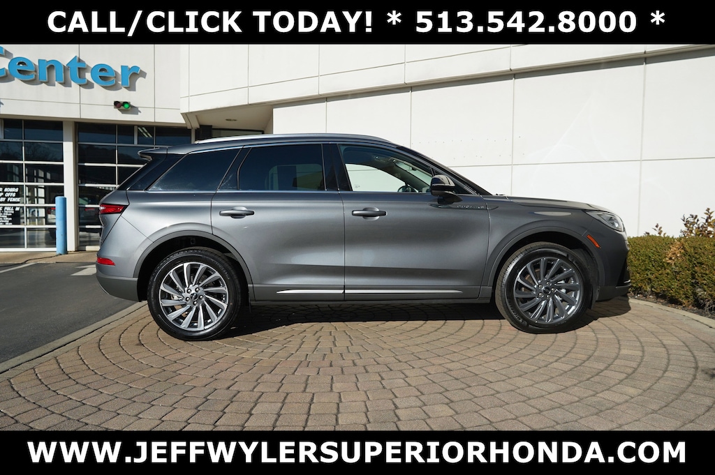 Jeff Wyler Superior Honda is very proud to offer this attractive 2024 Lincoln Corsair Reserve in Asher Gray Metallic Clearcoat. BLUETOOTH, LEATHER, MOONROOF SUNROOF, CLEAN CARFAX...NO ACCIDENTS, and ONE OWNER Equipment Group 201A (2 Additional USB Ports in Rear of Center Console, 60/40 EasyFold Rear Seat w/Power Seatback Release, Frameless Auto Dimming Rearview Mirror, Hands-Free Liftgate, Heated Sideview Mirrors, Heated Steering Wheel, Heated/Ventilated Driver & Front Passenger Seats, Phone As A Key (PAAK), Power Tilt/Telescoping Steering Column w/Memory, Rain Sensing Wipers, Universal Garage Door Opener, Windshield Wiper De-Icer, and Wireless Charging Pad), Corsair Reserve, 4D Sport Utility, 2.0L I4, 8-Speed Automatic, AWD, Asher Gray Metallic Clearcoat, Sandstone Leather, 19" Bright Machined Aluminum Wheels, 3.81 Axle Ratio, 360-Degree Camera, 4-Wheel Disc Brakes, 9 Speakers, ABS brakes, Air Conditioning, Alexa Built-In, All-Weather Floor Liners w/Fr&Rr Carpet Floor Mats, Alloy wheels, AM/FM radio: SiriusXM, Apple CarPlay/Android Auto, Auto High-beam Headlights, Auto-dimming Rear-View mirror, Automatic temperature control, Brake assist, Bumpers: body-color, Cargo Area Protector, Compass, Delay-off headlights, Driver door bin, Driver vanity mirror, Dual front impact airbags, Dual front side impact airbags, Electronic Stability Control, Emergency communication system: 911 Assist, Four wheel independent suspension, Front anti-roll bar, Front Bucket Seats, Front Center Armrest, Front dual zone A/C, Front reading lights, Front/Side/Rear Parking Sensors, Fully automatic headlights, Heated door mirrors, Heated front seats, Illuminated entry, Knee airbag, Lane Departure Warning System, Leather steering wheel, Low tire pressure warning, Memory seat, Navigation system: Connected Navigation (3-year trial), Occupant sensing airbag, Outside temperature display, Overhead airbag, Overhead console, Panic alarm, Passenger door bin, Passenger vanity mirror, Power door mirrors, Power driver seat, Power Liftgate, Power passenger seat, Power steering, Power windows, Premium Leather-Trimmed Heated Captain's Chairs, Radio data system, Radio: Lincoln Premium Audio System w/MP3, Rear anti-roll bar, Rear Parking Sensors, Rear reading lights, Rear seat center armrest, Rear window defroster, Rear window wiper, Remote keyless entry, Reverse Brake Assist, Roof rack: rails only, Security system, SiriusXM Radio, Speed control, Speed-sensing steering, Speed-Sensitive Wipers, Split folding rear seat, Spoiler, Steering wheel mounted A/C controls, Steering wheel mounted audio controls, SYNC 4 Communications & Entertainment System, Tachometer, Telescoping steering wheel, Tilt steering wheel, Traction control, Trip computer, and Variably intermittent wipers Our PRE-OWNED vehicles are put through a rigorous 167- POINT QUALITY ASSURANCE INSPECTION along with an average amount of over $1,400.00 SPENT to recondition each vehicle so we can be sure to deliver you the highest quality vehicle like you deserve! ***ONLINE PRICE DOES NOT INCLUDE WYLER FAMILY FIRST PACKAGE*** Stop by 4777 Spring Grove Ave. Road to see for yourself, or give us a call @ 283-209-1858 to schedule your test drive!