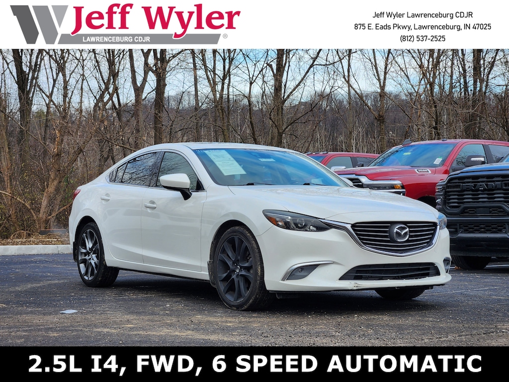Jeff Wyler Chrysler Dodge Jeep of Lawrenceburg is excited to offer this great-looking 2016 Mazda Mazda6 i Grand Touring in Snowflake White Pearl Mica. 11 Speakers, 3 Level Heated Reclining Front Sport Bucket Seats, 4-Wheel Disc Brakes, ABS brakes, Air Conditioning, Alloy wheels, AM/FM radio: SiriusXM, Anti-whiplash front head restraints, Auto-dimming door mirrors, Auto-dimming Rear-View mirror, Automatic temperature control, Brake assist, Bumpers: body-color, CD player, Compass, Delay-off headlights, Driver door bin, Driver vanity mirror, Dual front impact airbags, Dual front side impact airbags, Electronic Stability Control, Exterior Parking Camera Rear, Four wheel independent suspension, Front anti-roll bar, Front Bucket Seats, Front Center Armrest, Front dual zone A/C, Front fog lights, Front reading lights, Fully automatic headlights, Garage door transmitter: HomeLink, Heads-Up Display, Heated door mirrors, Heated front seats, Illuminated entry, Leather Seat Trim, Leather Shift Knob, Low tire pressure warning, Memory seat, Navigation System, Occupant sensing airbag, Outside temperature display, Overhead airbag, Overhead console, Panic alarm, Passenger door bin, Passenger vanity mirror, Power door mirrors, Power driver seat, Power moonroof, Power passenger seat, Power steering, Power windows, Radio data system, Radio: AM/FM/CD/MP3/AUX BOSE 11-Speaker & HD Radio, Rain sensing wipers, Rear anti-roll bar, Rear reading lights, Rear seat center armrest, Rear window defroster, Remote keyless entry, Security system, Snowflake White Pearl Mica Paint Charge, Speed control, Speed-sensing steering, Split folding rear seat, Spoiler, Steering wheel mounted audio controls, Tachometer, Telescoping steering wheel, Tilt steering wheel, Traction control, Trip computer, Turn signal indicator mirrors, Variably intermittent wipers, and Wheels: 19" Alloy w/Dark Silver Finish Our PRE-OWNED vehicles are put through a rigorous 167- POINT QUALITY ASSURANCE INSPECTION along with an average amount of over $1,400.00 SPENT to recondition each vehicle so we can be sure to deliver you the highest quality vehicle like you deserve! ***ONLINE PRICE DOES NOT INCLUDE WYLER FAMILY FIRST PACKAGE*** Stop by 4136 Shelbyville Road to see for yourself, or give us a call @ 502-897-3151 to schedule your test drive! Ask about available certifications.