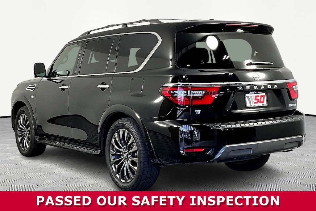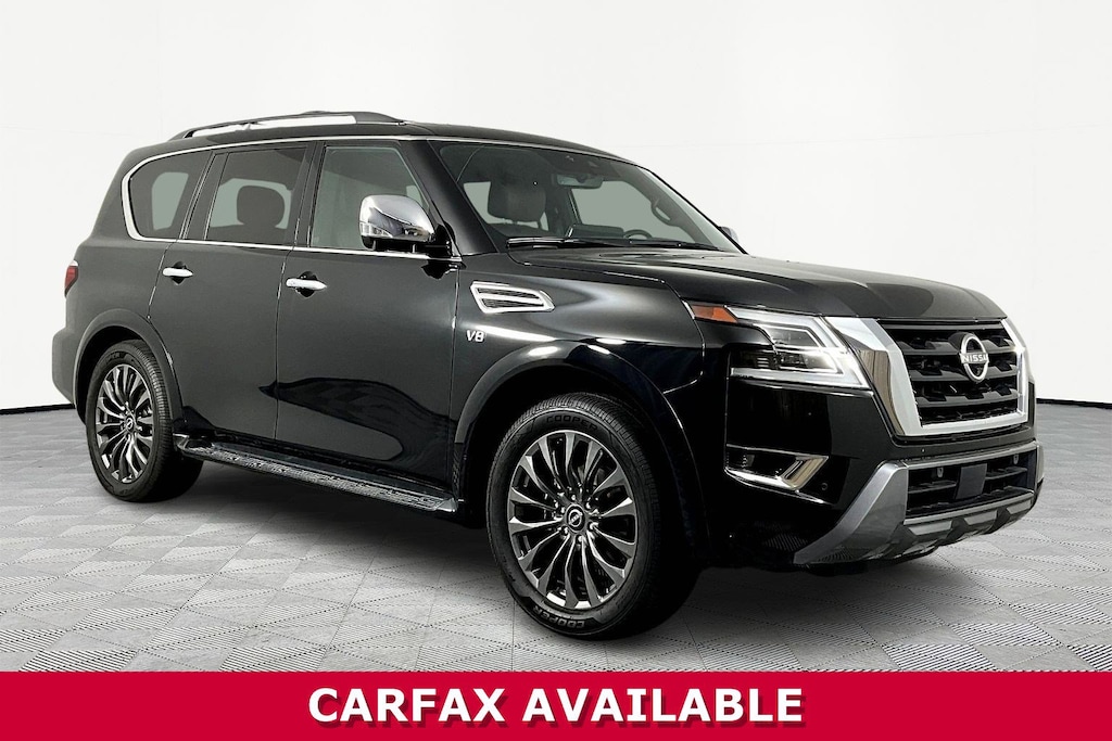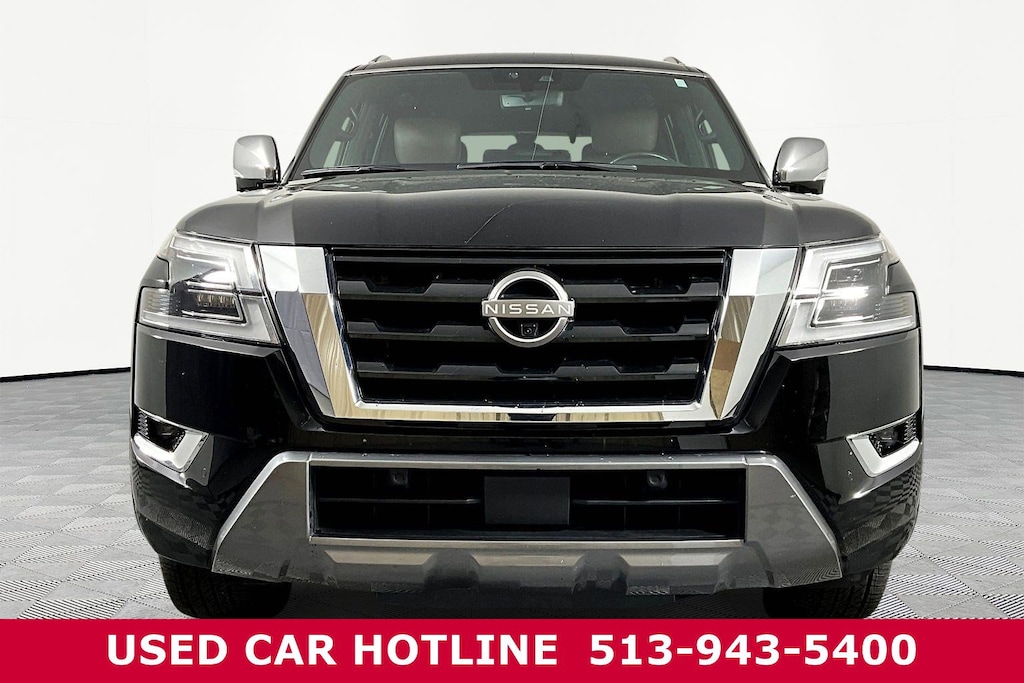 Jeff Wyler Eastgate Auto Mall is proud to offer this wonderful 2021 Nissan Armada Platinum in Super Black. Well equipped with: 13 Speakers, 2.94 Axle Ratio, 3rd Row Carpeted Floor Mats - Bench Seat, 3rd row seats: split-bench, 4-Wheel Disc Brakes, A/V remote, ABS brakes, Air Conditioning, Alloy wheels, AM/FM radio: SiriusXM, Anti-whiplash front head restraints, Auto High-beam Headlights, Auto tilt-away steering wheel, Auto-dimming door mirrors, Auto-dimming Rear-View mirror, Auto-leveling suspension, Automatic temperature control, Brake assist, Bumpers: body-color, Climate-Controlled Front Bucket Seats, Cross Bars, Delay-off headlights, Driver door bin, Driver vanity mirror, Dual front impact airbags, Dual front side impact airbags, Electronic Stability Control, Emergency communication system: NissanConnect Services, Exterior Parking Camera Rear, Four wheel independent suspension, Front anti-roll bar, Front Bucket Seats, Front Center Armrest, Front dual zone A/C, Front fog lights, Front reading lights, Fully automatic headlights, Garage door transmitter: HomeLink, Headphones, Heated door mirrors, Heated front seats, Heated rear seats, Heated steering wheel, Illuminated entry, Leather Shift Knob, Low tire pressure warning, Memory seat, Navigation System, NissanConnect featuring Apple CarPlay and Android Auto, Occupant sensing airbag, Outside temperature display, Overhead airbag, Overhead console, Panic alarm, Passenger door bin, Passenger vanity mirror, Power door mirrors, Power driver seat, Power Liftgate, Power moonroof, Power passenger seat, Power steering, Power windows, Quilted Leather Seat Trim, Radio: NissanConnect w/SiriusXM, Rain sensing wipers, Rear air conditioning, Rear anti-roll bar, Rear reading lights, Rear seat center armrest, Rear window defroster, Rear window wiper, Reclining 3rd row seat, Remote keyless entry, Security system, Speed control, Speed-sensing steering, Speed-Sensitive Wipers, Split folding rear seat, Spoiler, Steering wheel memory, Steering wheel mounted audio controls, Tachometer, Telescoping steering wheel, Tilt steering wheel, Traction control, Trip computer, Turn signal indicator mirrors, Variably intermittent wipers, Ventilated front seats, Voltmeter, and Wheels: 22" Machine-Faced w/Tinted Clear Coat. Clean CARFAX. Ask about available certifications. Used vehicles 10 years of age or newer with less than 100,000 miles are eligible for the Wyler Assurance Program, but eligible vehicles must pass our reconditioning process and multi-point inspection. Provided the vehicle passes inspection, vehicles will be eligible for the 6 month/6,000 mile limited warranty. The 6 month/6,000 mile limited warranty is NOT available on AS-IS vehicles, wholesale vehicles, lease buyback/pass-thru vehicles or un-inspected vehicles. Note that this program can also apply to vehicles where the remaining factory coverage is less than 6 months or 6,000 miles. Please check the Federal Trade Commission (FTC) Buyers guide on the vehicle for full details as to whether or not warranty coverage may apply. Contact Dealer for additional details. The Wyler Assurance 6 month/6,000 Mile limited warranty ends 6 months from the date of the Retail Purchase Agreement (BUYERS ORDER) or when the vehicle's odometer registers 6,000 additional miles to the mileage listed on the BUYERS ORDER, whichever comes first. Your Deductible - The warranty holder on your contract pays the first $100 of each covered repair.