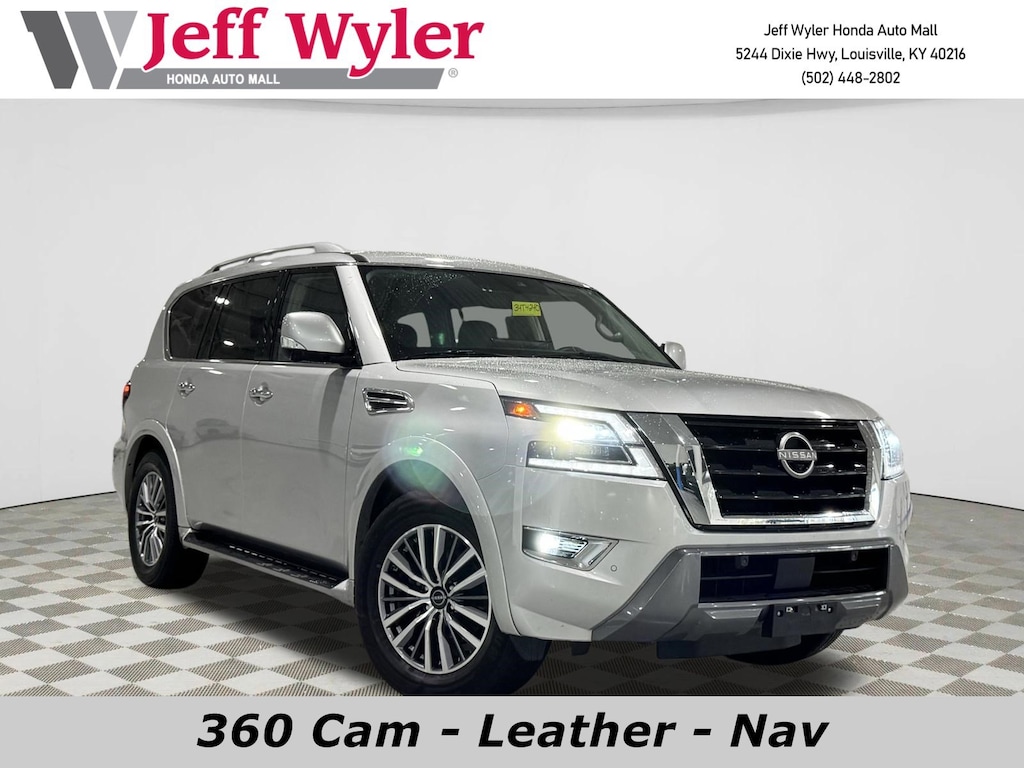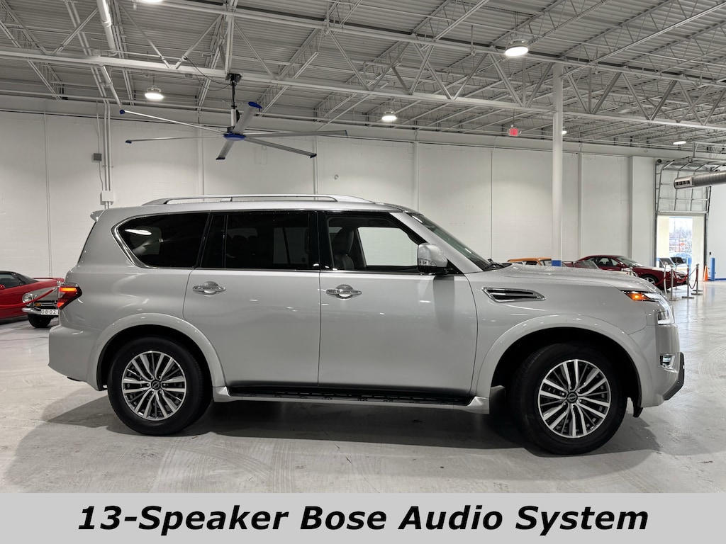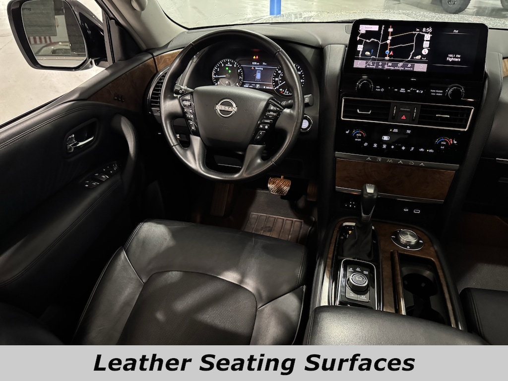4WD/AWD, Bluetooth, Dual climate Control, Heated Leather Seats, Navigation, Power Sun Roof, Push Button Start, Backup Camera, Third Row Seating, V8 Engine, 4WD, 13 Speakers, 2.937 Axle Ratio, 3rd Row Carpeted Floor Mats - Bench Seat, 3rd row seats: split-bench, 4-Wheel Disc Brakes, ABS brakes, Air Conditioning, Alloy wheels, AM/FM radio: SiriusXM, Anti-whiplash front head restraints, Auto High-beam Headlights, Auto tilt-away steering wheel, Auto-dimming door mirrors, Auto-dimming Rear-View mirror, Auto-leveling suspension, Automatic temperature control, Brake assist, Bumpers: body-color, Delay-off headlights, Driver door bin, Driver vanity mirror, Dual front impact airbags, Dual front side impact airbags, Electronic Stability Control, Emergency communication system: NissanConnect Services, Exterior Parking Camera Rear, Four wheel independent suspension, Front anti-roll bar, Front Bucket Seats, Front Center Armrest, Front dual zone A/C, Front fog lights, Front reading lights, Fully automatic headlights, Garage door transmitter: HomeLink, Heated door mirrors, Heated Front Bucket Seats, Heated front seats, Heated steering wheel, HVAC memory, Illuminated entry, Knee airbag, Leather Shift Knob, Leather steering wheel, Leather-Appointed Seat Trim, Low tire pressure warning, Memory seat, Navigation System, Occupant sensing airbag, Outside temperature display, Overhead airbag, Overhead console, Panic alarm, Passenger door bin, Passenger vanity mirror, Power door mirrors, Power driver seat, Power Liftgate, Power moonroof, Power passenger seat, Power steering, Power windows, Radio: NissanConnect w/SiriusXM, Rear air conditioning, Rear anti-roll bar, Rear reading lights, Rear seat center armrest, Rear window defroster, Rear window wiper, Reclining 3rd row seat, Remote keyless entry, Security system, Speed control, Speed-sensing steering, Speed-Sensitive Wipers, Split folding rear seat, Spoiler, Steering wheel memory, Steering wheel mounted audio controls, Tachometer, Telescoping steering wheel, Tilt steering wheel, Traction control, Trip computer, Turn signal indicator mirrors, Variably intermittent wipers, Voltmeter, Wheels: 20" x 8J Painted Alloy. CARFAX One-Owner. 4WD 7-Speed Automatic 5.6L V8 DOHC 32V LEV3-ULEV125 400hp13/18 City/Highway MPGAsk about available certifications.
