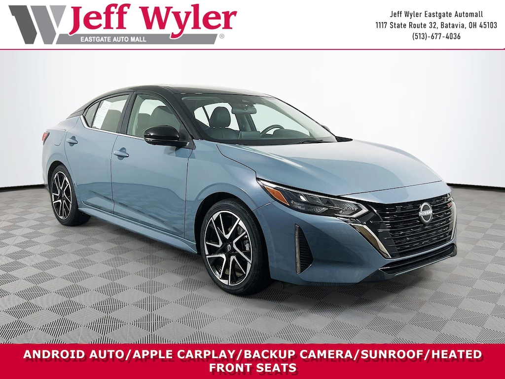 Jeff Wyler Eastgate Auto Mall is pleased to offer this wonderful-looking 2024 Nissan Sentra SR in Atlantic Gray Metallic/Super Black. Well equipped with: SR Premium Package (6-Way Power Driver's Seat, Bose Premium Audio System w/8 Speakers, Heated Steering Wheel, Intelligent Around View Monitor (I-AVM), Leatherette Seat Trim, NissanConnect Services, Power Sliding Glass Moonroof w/Tilt Feature, Sunvisors w/Illuminated Vanity Mirrors, and Wi-Fi Hotspot), 18" Alloy Wheels, 2-Tone Premium Paint, 4-Wheel Disc Brakes, 6 Speakers, ABS brakes, Air Conditioning, Alloy wheels, AM/FM radio: SiriusXM, Auto High-beam Headlights, Automatic temperature control, Blind Spot Warning, Brake assist, Bumpers: body-color, Carpeted Floor Mats w/Trunk Mat, Clear Rear Bumper Protector, Delay-off headlights, Door Sill Plates, Driver door bin, Driver vanity mirror, Dual front impact airbags, Dual front side impact airbags, Electronic Stability Control, Four wheel independent suspension, Front anti-roll bar, Front Bucket Seats, Front Center Armrest, Front dual zone A/C, Front reading lights, Fully automatic headlights, Heated door mirrors, Heated Front Bucket Seats, Heated front seats, Illuminated entry, Knee airbag, Leather Shift Knob, Leather steering wheel, Low tire pressure warning, Map Pocket Lighting, Nissan USB Charging Cable Set, NissanConnect featuring Apple CarPlay and Android Auto, Occupant sensing airbag, Outside temperature display, Overhead airbag, Overhead console, Panic alarm, Passenger door bin, Passenger vanity mirror, Power door mirrors, Power steering, Power windows, Radio data system, Radio: AM/FM w/RDS/MP3/Aux-In, Rear anti-roll bar, Rear Parking Sensors, Rear seat center armrest, Rear side impact airbag, Rear window defroster, Remote keyless entry, Security system, Speed control, Speed-sensing steering, Split folding rear seat, Spoiler, Sport Cloth Seat Trim, Steering wheel mounted audio controls, Tachometer, Technical Spec Change 2, Telescoping steering wheel, Tilt steering wheel, Traction control, Trip computer, Turn signal indicator mirrors, and Variably intermittent wipers. CARFAX One-Owner. Clean CARFAX. Ask about available certifications. Used vehicles 10 years of age or newer with less than 100,000 miles are eligible for the Wyler Assurance Program, but eligible vehicles must pass our reconditioning process and multi-point inspection. Provided the vehicle passes inspection, vehicles will be eligible for the 6 month/6,000 mile limited warranty. The 6 month/6,000 mile limited warranty is NOT available on AS-IS vehicles, wholesale vehicles, lease buyback/pass-thru vehicles or un-inspected vehicles. Note that this program can also apply to vehicles where the remaining factory coverage is less than 6 months or 6,000 miles. Please check the Federal Trade Commission (FTC) Buyers guide on the vehicle for full details as to whether or not warranty coverage may apply. Contact Dealer for additional details. The Wyler Assurance 6 month/6,000 Mile limited warranty ends 6 months from the date of the Retail Purchase Agreement (BUYERS ORDER) or when the vehicle's odometer registers 6,000 additional miles to the mileage listed on the BUYERS ORDER, whichever comes first. Your Deductible - The warranty holder on your contract pays the first $100 of each covered repair.