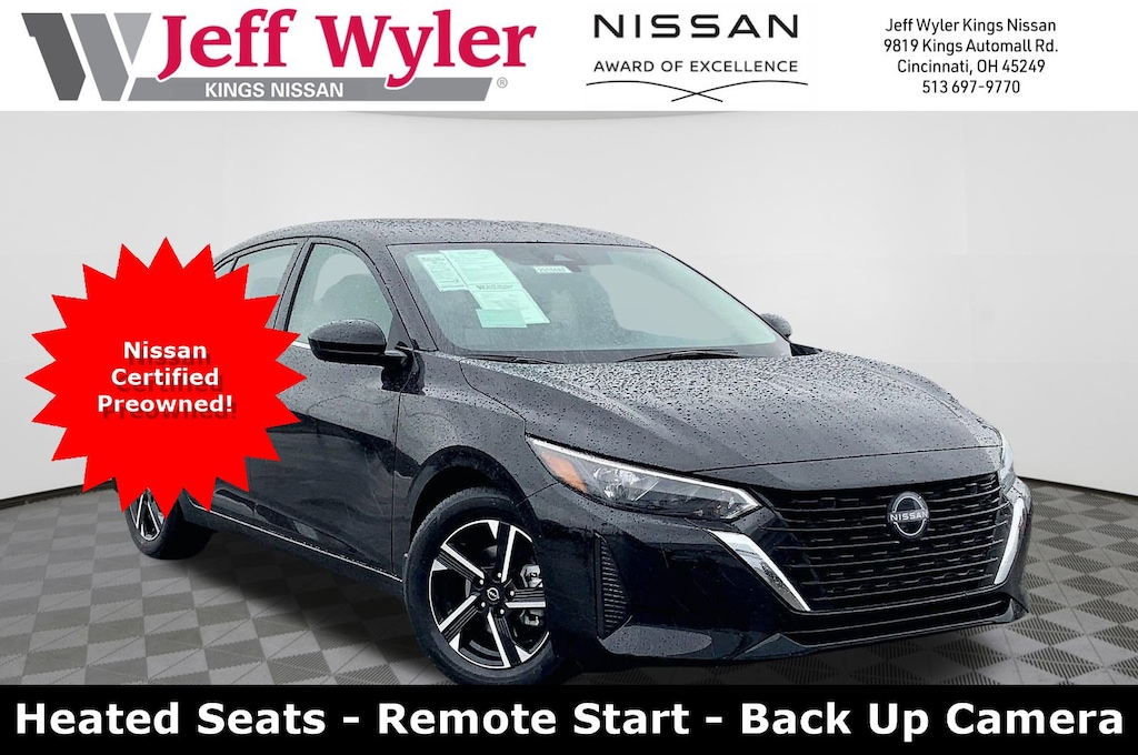 Jeff Wyler Kings Nissan is pumped up to offer this good-looking 2025 Nissan Sentra SV in Super Black. Well equipped with: All-Weather Package (Dual Zone Auto Climate Control, Heated Exterior Mirrors, Heated Front Seats, Leather-Wrapped Heated Steering Wheel, and Remote Engine Start), CVT with Xtronic, Charcoal Cloth, 16" Alloy Wheels, 4-Wheel Disc Brakes, 8 Speakers, ABS brakes, Air Conditioning, Alloy wheels, AM/FM radio: SiriusXM, Auto High-beam Headlights, Blind Spot Warning, Body Colored Splash Guards (4-Piece), Brake assist, Bumpers: body-color, Carpeted Floor Mats with Trunk Mat, Delay-off headlights, Door Sill Plates, Driver door bin, Driver vanity mirror, Dual front impact airbags, Dual front side impact airbags, Electronic Stability Control, Four wheel independent suspension, Front anti-roll bar, Front Bucket Seats, Front Center Armrest, Front reading lights, Fully automatic headlights, Illuminated entry, Knee airbag, Low tire pressure warning, NissanConnect featuring Apple CarPlay and Android Auto, Occupant sensing airbag, Outside temperature display, Overhead airbag, Overhead console, Panic alarm, Passenger door bin, Passenger vanity mirror, Power door mirrors, Power steering, Power windows, Radio data system, Radio: AM/FM with RDS/MP3/Aux-in, Rear anti-roll bar, Rear Parking Sensors, Rear side impact airbag, Rear window defroster, Remote keyless entry, Security system, Speed control, Speed-sensing steering, Split folding rear seat, Steering wheel mounted audio controls, Tachometer, Telescoping steering wheel, Tilt steering wheel, Traction control, Trip computer, Upgraded Cloth Seat Trim, and Variably intermittent wipers.Ask about available certifications.
