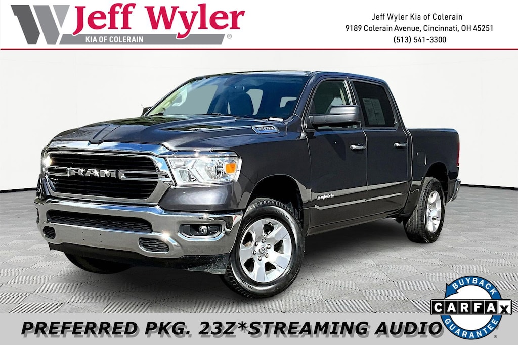 Jeff Wyler Kia of Colerain is proud to offer this great 2019 Ram 1500 Big Horn/Lone Star in Granite Crystal Metallic Clearcoat. Quick Order Package 23Z Big Horn/Lone Star (Steering Wheel Mounted Audio Controls), 3 Rear Seat Head Restraints, 3.21 Rear Axle Ratio, 3.55 Rear Axle Ratio, 4 Way Front Headrests, 4-Wheel Disc Brakes, 48V Belt Starter Generator, 6 Speakers, ABS brakes, Air Conditioning, Alloy wheels, AM/FM radio, Anti-Spin Differential Rear Axle, Brake assist, Bumpers: chrome, Cloth Bench Seat, Compass, Delay-off headlights, Driver door bin, Dual front impact airbags, Dual front side impact airbags, Electronic Stability Control, Front anti-roll bar, Front Center Armrest w/Storage, Front fog lights, Front reading lights, Front Seat Back Map Pockets, Front wheel independent suspension, Fully automatic headlights, GPS Antenna Input, Heated door mirrors, Illuminated entry, Leather steering wheel, Low tire pressure warning, Manufacturer's Statement of Origin, Occupant sensing airbag, Outside temperature display, Overhead airbag, Overhead console, Panic alarm, ParkView Rear Back-Up Camera, Passenger door bin, Passenger vanity mirror, Power door mirrors, Power steering, Power windows, Radio data system, Radio: Uconnect 3 w/5" Display, Rear 60/40 Folding Seat, Rear anti-roll bar, Rear seat center armrest, Rear step bumper, Remote keyless entry, Speed control, Split folding rear seat, Tachometer, Telescoping steering wheel, Tilt steering wheel, Traction control, Trip computer, Variably intermittent wipers, Voltmeter, and Wheels: 18" x 8" Our PRE-OWNED vehicles are put through a rigorous 167- POINT QUALITY ASSURANCE INSPECTION along with an average amount of over $1,400.00 SPENT to recondition each vehicle so we can be sure to deliver you the highest quality vehicle like you deserve! ***ONLINE PRICE DOES NOT INCLUDE WYLER FAMILY FIRST PACKAGE***