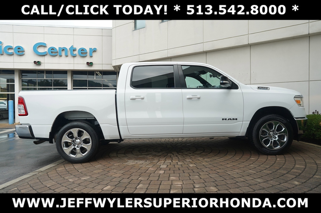 Jeff Wyler Superior Honda is pleased to offer this gorgeous 2022 Ram 1500 Big Horn/Lone Star in Bright White Clearcoat. BLUETOOTH, RECENT SUPERIOR TRADE, ONE OWNER, HomeLink® Remote System, and Bluetooth® HandsFreeLink - Bluetooth® Streaming Audio Big Horn Level An Equipment Group (DISC) (2nd Row In Floor Storage Bins, 4G LTE Wi-Fi Hot Spot, 8.4" Touchscreen Display, Apple CarPlay, Auto-Dimming Exterior Driver Mirror, Auto-Dimming Rear-View Mirror, Black Premium Power Mirrors (GUL), Bluetooth Handsfree Phone & Audio, Class IV Receiver Hitch, Cluster 3.5" TFT Color Display, Connectivity - US/Canada, Exterior Mirrors Courtesy Lamps, Exterior Mirrors w/Supplemental Signals, Foam Bottle Insert (Door Trim Panel), For More Info, Call 800-643-2112, Glove Box Lamp, Google Android Auto, Integrated Center Stack Radio, Power 2-Way Driver Lumbar Adjust, Power 8-Way Driver Seat, Power Adjustable Pedals, Radio: Uconnect 5 W w/8.4" Display, Rear Dome w/On/Off Switch Lamp, Rear Power Sliding Window, Rear Window Defroster, SiriusXM Radio Service, SiriusXM Satellite Radio, Sun Visors w/Illuminated Vanity Mirrors, Universal Garage Door Opener, and USB Host Flip), Quick Order Package 23Z Big Horn (Big Horn Badge), 1500 Big Horn/Lone Star, 4D Crew Cab, 3.6L V6 24V VVT, 8-Speed Automatic, 4WD, Bright White Clearcoat, Black Cloth, 3 Rear Seat Head Restraints, 3.21 Rear Axle Ratio, 4 Way Front Headrests, 4-Wheel Disc Brakes, 48V Belt Starter Generator, 6 Speakers, ABS brakes, Air Conditioning, Air Conditioning ATC w/Dual Zone Control, All R1 High Radios, All Radio Equipped Vehicles, Alloy wheels, AM/FM radio, Black Exterior Mirrors, Brake assist, Bumpers: chrome, Cloth Bench Seat, Cluster 7.0" TFT Color Display, Compass, Connected Travel & Traffic Services, Convex Wide-Angle Mirror Insert, Delay-off headlights, Disassociated Touchscreen Display, Driver door bin, Dual front impact airbags, Dual front side impact airbags, Electronic Stability Control, Emergency communication system: SiriusXM Guardian, For Details, Visit DriveUconnect.com, Front anti-roll bar, Front Center Armrest w/Storage, Front fog lights, Front reading lights, Front Seat Back Map Pockets, Front wheel independent suspension, Fully automatic headlights, Global Telematics Box Module (TBM), GPS Antenna Input, GPS Navigation, HD Radio, Heated door mirrors, Illuminated entry, Integrated Voice Command w/Bluetooth, Leather steering wheel, Low tire pressure warning, MOPAR Front & Rear Rubber Floor Mats, Occupant sensing airbag, Outside temperature display, Overhead airbag, Overhead console, Panic alarm, ParkView Rear Back-Up Camera, Passenger door bin, Passenger vanity mirror, Power door mirrors, Power steering, Power windows, Radio data system, Radio: Uconnect 3 w/5" Display, Radio: Uconnect 5 Nav w/8.4" Display, Rear 60/40 Folding Seat, Rear anti-roll bar, Rear seat center armrest, Rear step bumper, Rear Underseat Compartment Storage (DISC), Remote keyless entry, Remote Start System, SiriusXM w/360L, Speed control, Split folding rear seat, Steering wheel mounted audio controls, Tachometer, Telescoping steering wheel, Tilt steering wheel, Traction control, Trip computer, Variably intermittent wipers, Voltmeter, Wheels: 18" x 8" Cast-Aluminum Painted, and Wheels: 20" x 9" Aluminum Chrome Clad Our PRE-OWNED vehicles are put through a rigorous 167- POINT QUALITY ASSURANCE INSPECTION along with an average amount of over $1,400.00 SPENT to recondition each vehicle so we can be sure to deliver you the highest quality vehicle like you deserve! ***ONLINE PRICE DOES NOT INCLUDE WYLER FAMILY FIRST PACKAGE*** Stop by 4777 Spring Grove Ave. Road to see for yourself, or give us a call @ 283-209-1858 to schedule your test drive!