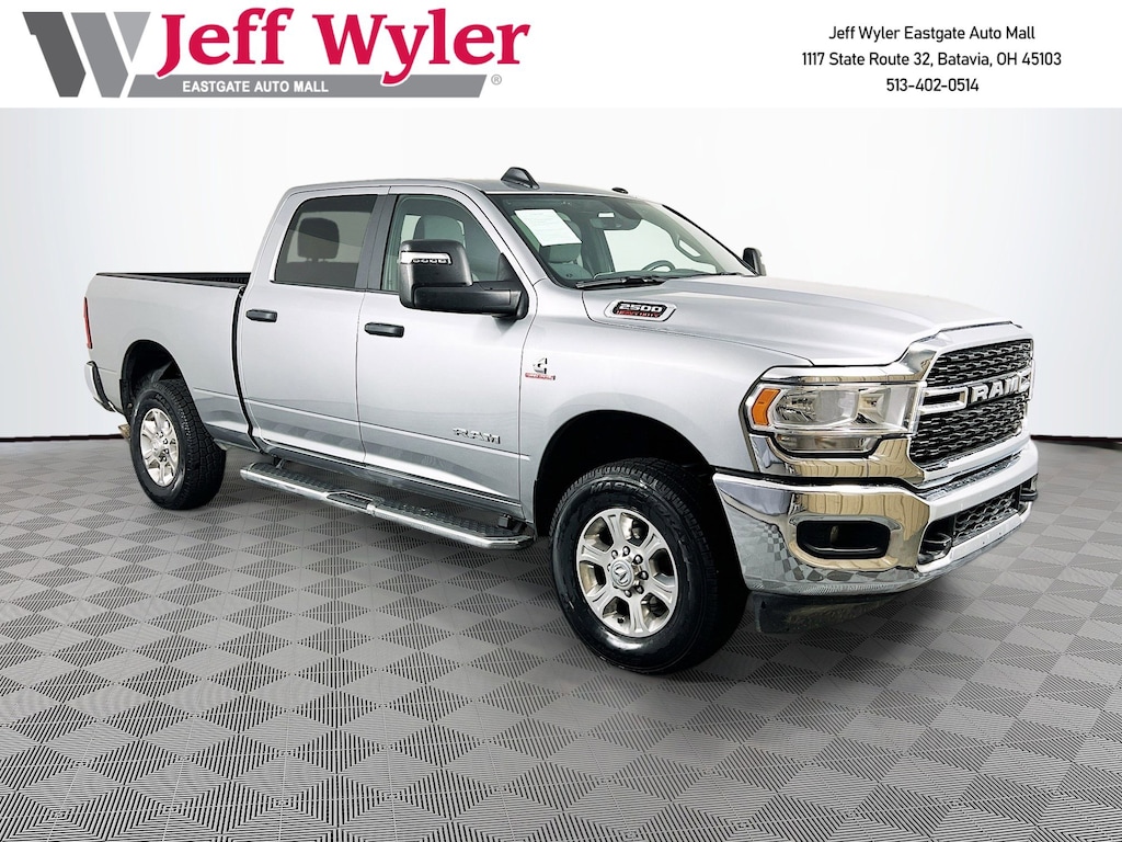 Jeff Wyler Eastgate Auto Mall is pleased to offer this beautiful 2024 Ram 2500 Big Horn in Billet Silver Metallic Clearcoat. Well equipped with: Level 1 Equipment Group (2 Way Rear Headrest Seat, 2nd Row In Floor Storage Bins, 4 Way Front Headrests, 40/20/40 Split Bench Seat, 4G LTE Wi-Fi Hot Spot, 8.4" Touchscreen Display, Apple CarPlay, Auto Power-Folding Mirrors, Big Horn IP Badge, Black Exterior Mirrors, Bluetooth Handsfree Phone & Audio, Center Hub, Connectivity - US/Canada, Dual Glove Boxes, Exterior Mirrors Courtesy Lamps, Exterior Mirrors w/Heating Element, Exterior Mirrors w/Supplemental Signals, Foam Bottle Insert (Door Trim Panel), Footwell Courtesy Lamp, For Details, Visit DriveUconnect.com, For More Info, Call 800-643-2112, Forward & Reverse Utility Lights, Front Armrest w/Cupholders, Front Center Seat Cushion Storage, Front Fog Lamps, Front Seat Back Map Pockets, Global Telematics Box Module (TBM), Glove Box Lamp, Google Android Auto, GPS Antenna Input, Integrated Center Stack Radio, Integrated Voice Command w/Bluetooth, Leather Wrapped Steering Wheel, Locking Lower Glove Box, Manual Adjust 4-Way Front Passenger Seat, Mirror Running Lights, Power 2-Way Driver Lumbar Adjust, Power Adjust 8-Way Driver Seat, Power Adjust Mirrors, Power Adjustable Convex Aux Mirrors, Power Heated Fold Telescope Mirrors, Power Telescoping Mirrors, Rear 60/40 Folding Seat, Rear Dome w/On/Off Switch Lamp, Remote USB Port - Charge Only, Selectable Tire Fill Alert, SiriusXM Radio Service, SiriusXM Satellite Radio, Steering Wheel Mounted Audio Controls, Storage Tray, and Wheels: 18" x 8.0" Polished Aluminum), Quick Order Package 2HZ Big Horn, 3.73 Axle Ratio, 4-Wheel Disc Brakes, 6 Speakers, ABS brakes, Active Noise Control System, Air Conditioning, Anti-Spin Differential Rear Axle, Brake assist, Bumpers: chrome, Center Stack Storage Drawer, Chrome Flat Cab-Length Side Steps, Cloth 40/20/40 Bench Seat, Compass, Delay-off headlights, Driver door bin, Dual front impact airbags, Dual front side impact airbags, Electronic Stability Control, Electronically Controlled Throttle, Emergency communication system: SiriusXM Guardian, Front anti-roll bar, Front Center Armrest w/Storage, Front License Plate Bracket, Front reading lights, Fully automatic headlights, Heated door mirrors, Illuminated entry, Low tire pressure warning, Manual Adjust 4-Way Driver Seat, Manufacturer's Statement of Origin, Occupant sensing airbag, Outside temperature display, Overhead airbag, Overhead console, Panic alarm, ParkView Rear Back-Up Camera, Passenger door bin, Passenger vanity mirror, Power door mirrors, Power steering, Power windows, Premium Cloth 40/20/40 Bench Seat (DISC), Radio data system, Radio: Uconnect 3 w/5" Display, Radio: Uconnect 5 W w/8.4" Display, Rear anti-roll bar, Rear Folding Seat, Rear seat center armrest, Rear step bumper, Remote keyless entry, Speed control, Tachometer, Tilt steering wheel, Tip Start, Tow Hooks, Traction control, Trip computer, Turn signal indicator mirrors, Variably intermittent wipers, Voltmeter, and Wheels: 18" x 8.0" Steel Chrome ClaD. CARFAX One-Owner. Ask about available certifications. Used vehicles 10 years of age or newer with less than 100,000 miles are eligible for the Wyler Assurance Program, but eligible vehicles must pass our reconditioning process and multi-point inspection. Provided the vehicle passes inspection, vehicles will be eligible for the 6 month/6,000 mile limited warranty. The 6 month/6,000 mile limited warranty is NOT available on AS-IS vehicles, wholesale vehicles, lease buyback/pass-thru vehicles or un-inspected vehicles. Note that this program can also apply to vehicles where the remaining factory coverage is less than 6 months or 6,000 miles. Please check the Federal Trade Commission (FTC) Buyers guide on the vehicle for full details as to whether or not warranty coverage may apply. Contact Dealer for additional details. The Wyler Assurance 6 month/6,000 Mile limited warranty ends 6 months from the