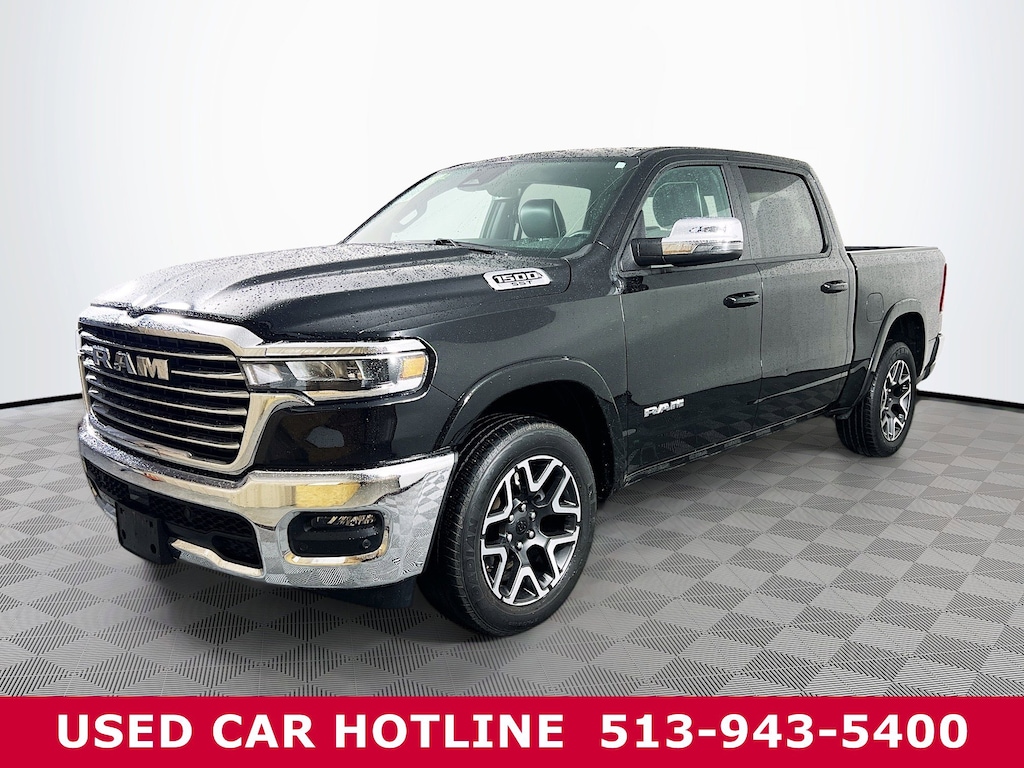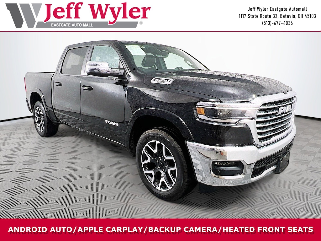 Jeff Wyler Eastgate Auto Mall is excited to offer this terrific 2025 Ram 1500 Laramie in Diamond Black Crystal Pearlcoat. Well equipped with: Laramie Level 1 Equipment Group (Rain Sensitive Windshield Wipers and Remote Tailgate Release), Quick Order Package 21H Laramie, 10 Speakers, 3 Rear Seat Head Restraints, 3.55 Rear Axle Ratio, 4 Way Front Headrests, 4-Wheel Disc Brakes, 4G LTE Wi-Fi Hot Spot, ABS brakes, Air Conditioning, Alloy wheels, AM/FM radio: SiriusXM with 360L, Apple CarPlay, Apple CarPlay/Android Auto, Audio memory, Auto High-beam Headlights, Auto Power-Folding Mirrors, Auto-dimming door mirrors, Auto-Dimming Exterior Driver Mirror, Auto-dimming Rear-View mirror, Automatic temperature control, Brake assist, Bumpers: chrome, Chrome Exterior Mirrors, Compass, Connected Travel & Traffic Services, Connectivity - US/Canada, Convex Wide-Angle Exterior Mirror Insert, Delay-off headlights, Driver door bin, Driver Seat Memory, Driver vanity mirror, Dual front impact airbags, Dual front side impact airbags, Electronic Stability Control, Exterior Mirrors Courtesy Lamps, Exterior Mirrors w/Heating Element, Exterior Mirrors w/Memory, Exterior Mirrors w/Supplemental Signals, Front anti-roll bar, Front Center Armrest w/Storage, Front dual zone A/C, Front fog lights, Front License Plate Bracket, Front reading lights, Front Seat Back Map Pockets, Front wheel independent suspension, Fully automatic headlights, Garage door transmitter, Google Android Auto, GPS Antenna Input, GPS Navigation, HD Radio, Heated door mirrors, Heated Front Seats, Heated front seats, Heated rear seats, Heated Steering Wheel, Heated steering wheel, Illuminated entry, Integrated Voice Command w/Bluetooth, Leather steering wheel, Leather Trim 40/20/40 Bench Seat, Low tire pressure warning, Manufacturer's Statement of Origin, Memory seat, Navigation System, Occupant sensing airbag, Outside temperature display, Overhead airbag, Overhead console, Panic alarm, ParkView Rear Back-Up Camera, Passenger door bin, Passenger vanity mirror, Power 2-Way Driver Lumbar Adjust, Power 2-Way Passenger Lumbar Adjust, Power Adjust 8-Way Front Passenger Seat, Power door mirrors, Power driver seat, Power passenger seat, Power steering, Power windows, Radio data system, Radio: Uconnect 5 Nav w/12.0" Display, RAM Grille Badge - Chrome, Rear anti-roll bar, Rear reading lights, Rear seat center armrest, Rear step bumper, Remote keyless entry, Security system, SiriusXM w/360L, Speed control, Split folding rear seat, Steering wheel mounted audio controls, Tachometer, Telescoping steering wheel, Tilt steering wheel, Traction control, Trip computer, Turn signal indicator mirrors, USB Host Flip, Variably intermittent wipers, Ventilated Front Seats, Ventilated front seats, Voltmeter, and Wheels: 20" x 9" Premium Paint/Polish. CARFAX One-Owner. Awards: * Motor Trend Automobiles of the year Ask about available certifications. Used vehicles 10 years of age or newer with less than 100,000 miles are eligible for the Wyler Assurance Program, but eligible vehicles must pass our reconditioning process and multi-point inspection. Provided the vehicle passes inspection, vehicles will be eligible for the 6 month/6,000 mile limited warranty. The 6 month/6,000 mile limited warranty is NOT available on AS-IS vehicles, wholesale vehicles, lease buyback/pass-thru vehicles or un-inspected vehicles. Note that this program can also apply to vehicles where the remaining factory coverage is less than 6 months or 6,000 miles. Please check the Federal Trade Commission (FTC) Buyers guide on the vehicle for full details as to whether or not warranty coverage may apply. Contact Dealer for additional details. The Wyler Assurance 6 month/6,000 Mile limited warranty ends 6 months from the date of the Retail Purchase Agreement (BUYERS ORDER) or when the vehicle's odometer registers 6,000 additional miles to the mileage listed on the BUYERS ORDER, whichever comes first. Your Deductible - The warranty holder on your c