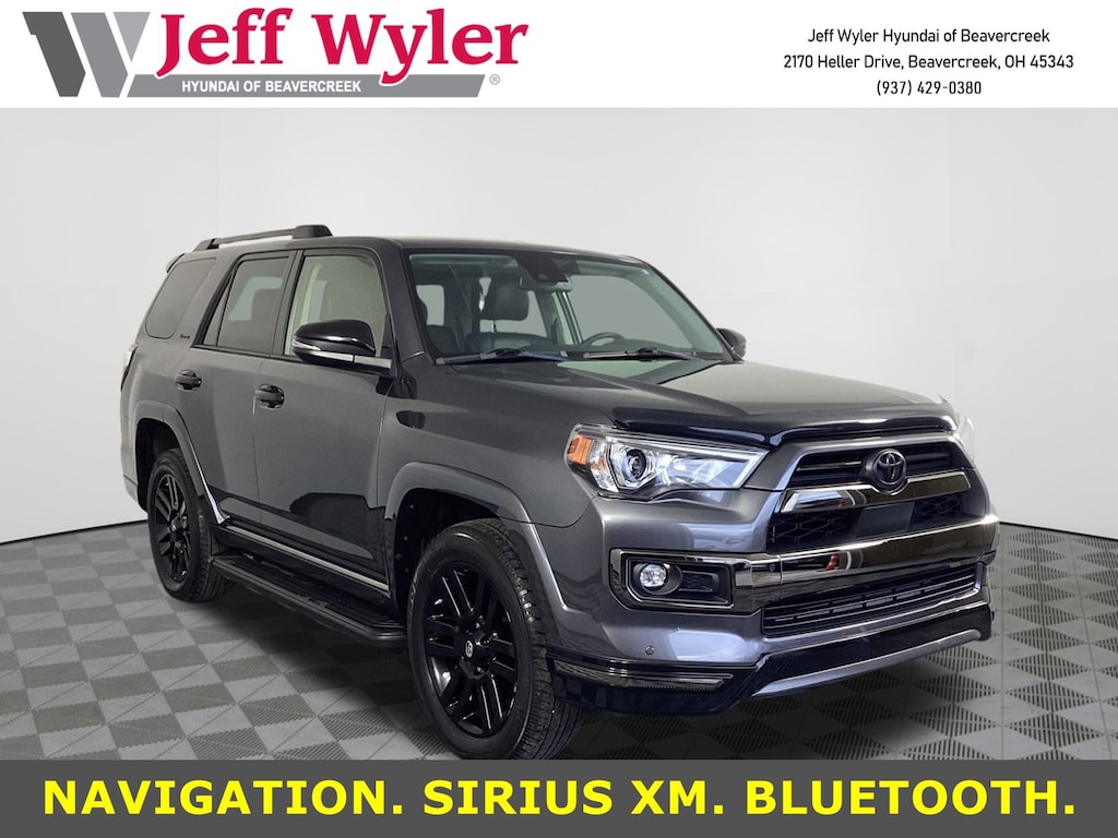 Clean CARFAX. Jeff Wyler Hyundai of Beavercreek is delighted to offer this fantastic 2021 Toyota 4Runner Nightshade in Magnetic Gray Metallic. Well equipped with: 15 Speakers, 3.727 Axle Ratio, 4-Wheel Disc Brakes, ABS brakes, Air Conditioning, Alloy wheels, AM/FM radio: SiriusXM, Anti-whiplash front head restraints, Apple CarPlay/Android Auto, Auto High-beam Headlights, Auto-dimming Rear-View mirror, Automatic temperature control, Black Power Heated Mirrors, Black Roof Rails, Brake assist, Bumpers: body-color, Compass, Delay-off headlights, Driver door bin, Driver vanity mirror, Dual front impact airbags, Dual front side impact airbags, Electronic Stability Control, Emergency communication system: Safety Connect with 1-year trial, Exterior Parking Camera Rear, Front anti-roll bar, Front Bucket Seats, Front Center Armrest, Front dual zone A/C, Front fog lights, Front reading lights, Front wheel independent suspension, Fully automatic headlights, Garage Door Opener, Garage door transmitter: HomeLink, Heated door mirrors, Heated front seats, Heated/Ventilated Front Bucket Seats, Illuminated entry, Knee airbag, Low tire pressure warning, Memory seat, Moonroof w/Tilt Up & Slide, Navigation System, Nightshade Leather Seat Trim, Occupant sensing airbag, Outside temperature display, Overhead airbag, Overhead console, Panic alarm, Passenger door bin, Passenger vanity mirror, Power door mirrors, Power driver seat, Power moonroof, Power passenger seat, Power steering, Power windows, Radio: Premium JBL Audio, Rear anti-roll bar, Rear seat center armrest, Rear window defroster, Rear window wiper, Remote keyless entry, Right & Left Individual Air Conditioner, Roof rack: rails only, Security system, Speed control, Speed-sensing steering, Split folding rear seat, Spoiler, Steering wheel mounted audio controls, Tachometer, Telescoping steering wheel, Tilt steering wheel, Traction control, Trip computer, Turn signal indicator mirrors, Variably intermittent wipers, Ventilated front seats, and Wheels: 20" Black Alloy.Come see the excitement at Jeff Wyler Hyundai of Beavercreek! Visit us online at www.jeffwylerhyundaiofbeavercreek.com Proudly Serving: Cincinnati, Dayton, Centeville, Ketttering, Moraine,Beavercreek, Xenia,Oakwood, Trotwood, Vandalia, Kettering, Wright Patterson, Riverside, Engelwood, Miamisburg, Huber Heights, Springboro, Brookville, Fairborn, West Carrollton, Yellow Springs, Bellbrook, Springfield Columbus, Hamilton, West Chester, Monroe, Fairfield.