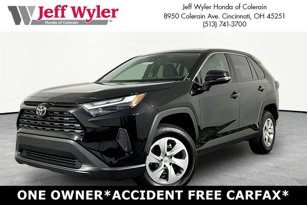 Jeff Wyler Honda of Colerain is pumped up to offer this fantastic 2023 Toyota RAV4 LE in Midnight Black Metallic. Well equipped with: 17" Steel Wheels, 4-Wheel Disc Brakes, 6 Speakers, ABS brakes, Air Conditioning, AM/FM radio: SiriusXM, Auto High-beam Headlights, Axle Ratio: 3.177, Brake assist, Bumpers: body-color, Driver door bin, Driver vanity mirror, Dual front impact airbags, Dual front side impact airbags, Electronic Stability Control, Emergency communication system: Safety Connect (10-year trial), Exterior Parking Camera Rear, Fabric Seat Trim, Four wheel independent suspension, Front anti-roll bar, Front Bucket Seats, Front Center Armrest, Front reading lights, Illuminated entry, Knee airbag, Low tire pressure warning, Occupant sensing airbag, Outside temperature display, Overhead airbag, Overhead console, Panic alarm, Passenger door bin, Passenger vanity mirror, Power door mirrors, Power steering, Power windows, Radio data system, Radio: AM/FM/XM Audio System, Rear anti-roll bar, Rear seat center armrest, Rear window defroster, Rear window wiper, Remote keyless entry, Speed control, Speed-sensing steering, Split folding rear seat, Spoiler, Steering wheel mounted audio controls, Tachometer, Telescoping steering wheel, Tilt steering wheel, Traction control, and Trip computer.