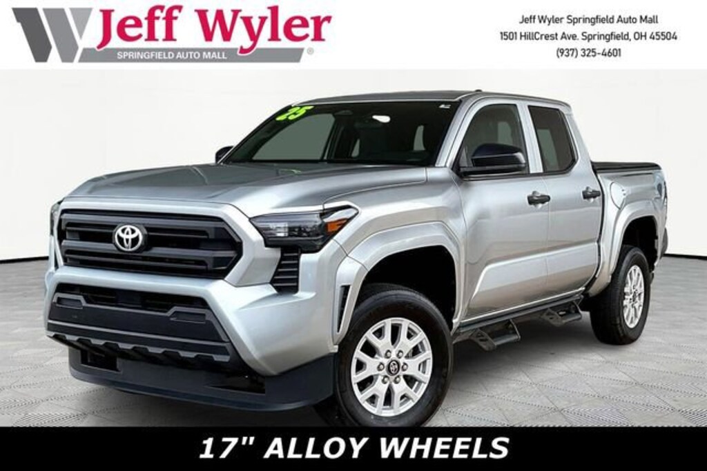 Jeff Wyler Springfield Auto Mall is delighted to offer this outstanding-looking 2025 Toyota Tacoma SR in Celestial Silver Metallic. Well equipped with: 3.583 Axle Ratio, 4-Wheel Disc Brakes, 6 Speakers, ABS brakes, Air Conditioning, Alloy wheels, AM/FM radio: SiriusXM, Anti-whiplash front head restraints, Apple CarPlay/Android Auto, Auto High-beam Headlights, Brake assist, Bumpers: body-color, Driver door bin, Dual front impact airbags, Dual front side impact airbags, Electronic Stability Control, Emergency communication system: Safety Connect (1-year trial), Exterior Parking Camera Rear, Fabric Seat Trim, Front anti-roll bar, Front Bucket Seats, Front Center Armrest, Front reading lights, Front wheel independent suspension, Fully automatic headlights, Heated door mirrors, Illuminated entry, Knee airbag, Low tire pressure warning, Occupant sensing airbag, Outside temperature display, Overhead airbag, Overhead console, Passenger door bin, Power door mirrors, Power steering, Power windows, Radio: 8 Toyota Audio Multimedia, Rear step bumper, Rear window defroster, Remote keyless entry, Speed control, Speed-sensing steering, Split folding rear seat, Steering wheel mounted audio controls, Tachometer, Telescoping steering wheel, Tilt steering wheel, Traction control, Trip computer, Variably intermittent wipers, and Wheels: 17 Styled Alloy. Ask about available certifications. Used vehicles 10 years of age or newer with less than 100,000 miles are eligible for the Wyler Assurance Program, but eligible vehicles must pass our reconditioning process and multi-point inspection. Provided the vehicle passes inspection, vehicles will be eligible for the 6 month/6,000 mile limited warranty. The 6 month/6,000 mile limited warranty is NOT available on AS-IS vehicles, wholesale vehicles, lease buyback/pass-thru vehicles or un-inspected vehicles. Note that this program can also apply to vehicles where the remaining factory coverage is less than 6 months or 6,000 miles. Please check the Federal Trade Commission (FTC) Buyers guide on the vehicle for full details as to whether or not warranty coverage may apply. Contact Dealer for additional details. The Wyler Assurance 6 month/6,000 Mile limited warranty ends 6 months from the date of the Retail Purchase Agreement (BUYERS ORDER) or when the vehicle's odometer registers 6,000 additional miles to the mileage listed on the BUYERS ORDER, whichever comes first. Your Deductible - The warranty holder on your contract pays the first $100 of each covered repair.