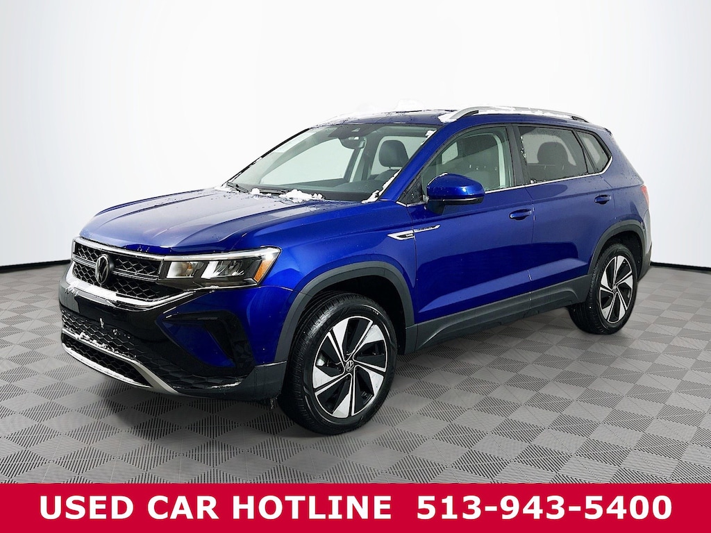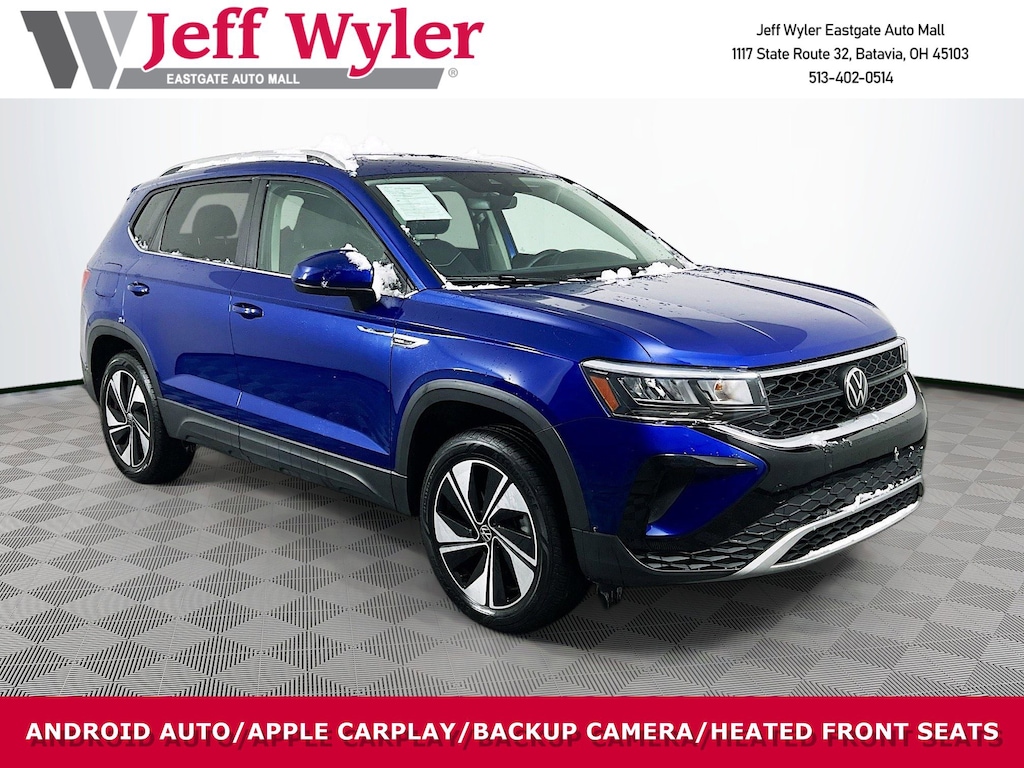 Jeff Wyler Eastgate Auto Mall is pumped up to offer this attractive-looking 2024 Volkswagen Taos 1.5T SE in Blue Metallic. Well equipped with: 4-Wheel Disc Brakes, 5.20 Axle Ratio, 6 Speakers, ABS brakes, Active Blind Spot Monitor, Air Conditioning, Alloy wheels, AM/FM radio: SiriusXM with 360L, Auto High-beam Headlights, Automatic temperature control, Brake assist, Bumpers: body-color, CloudTex & Cloth Seating Surfaces, Compass, Delay-off headlights, Driver door bin, Driver vanity mirror, Dual front impact airbags, Dual front side impact airbags, Electronic Stability Control, Emergency communication system: VW Car-Net Safe & Secure 5-year, Exterior Parking Camera Rear, Four wheel independent suspension, Front anti-roll bar, Front Bucket Seats, Front Center Armrest, Front dual zone A/C, Front reading lights, Front Strut Rear Multi-Link Suspension, Fully automatic headlights, Heated door mirrors, Heated Front Bucket Seats, Heated front seats, Heated steering wheel, Illuminated entry, Leather Shift Knob, Low tire pressure warning, Occupant sensing airbag, Outside temperature display, Overhead airbag, Overhead console, Panic alarm, Passenger door bin, Passenger vanity mirror, Power door mirrors, Power driver seat, Power steering, Power windows, Radio data system, Radio: MIB3 Composition Media AM/FM/HD, Rain sensing wipers, Rear anti-roll bar, Rear seat center armrest, Rear window defroster, Rear window wiper, Remote keyless entry, Rubber Mats Kit (SNM), Security system, Speed control, Speed-sensing steering, Split folding rear seat, Spoiler, Steering wheel mounted audio controls, Tachometer, Telescoping steering wheel, Tilt steering wheel, Traction control, Trip computer, Variably intermittent wipers, and Wheels: 18" 2-Tone Machined Alloy. CARFAX One-Owner. Clean CARFAX. Ask about available certifications. Used vehicles 10 years of age or newer with less than 100,000 miles are eligible for the Wyler Assurance Program, but eligible vehicles must pass our reconditioning process and multi-point inspection. Provided the vehicle passes inspection, vehicles will be eligible for the 6 month/6,000 mile limited warranty. The 6 month/6,000 mile limited warranty is NOT available on AS-IS vehicles, wholesale vehicles, lease buyback/pass-thru vehicles or un-inspected vehicles. Note that this program can also apply to vehicles where the remaining factory coverage is less than 6 months or 6,000 miles. Please check the Federal Trade Commission (FTC) Buyers guide on the vehicle for full details as to whether or not warranty coverage may apply. Contact Dealer for additional details. The Wyler Assurance 6 month/6,000 Mile limited warranty ends 6 months from the date of the Retail Purchase Agreement (BUYERS ORDER) or when the vehicle's odometer registers 6,000 additional miles to the mileage listed on the BUYERS ORDER, whichever comes first. Your Deductible - The warranty holder on your contract pays the first $100 of each covered repair.